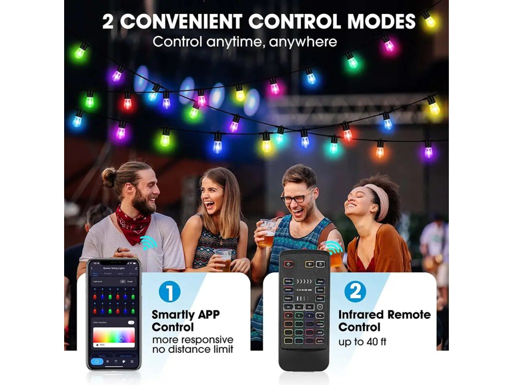 Łańcuchem można sterować na dwa sposoby – za pomocą pilota lub telefonu komórkowego dzięki aplikacji Tuya Smart. Ważnym elementem, który z pewnością docenią zwłaszcza imprezowicze, jest bezprzewodowe połączenie łańcuszka z telefonem komórkowym. Łańcuszkiem można sterować za pomocą aplikacji Tuya Smart (dzięki czemu jest kompatybilny z Amazon Alexa i Asystentem Google). Łańcuszek posiada synchronizację muzyczną z kolorami LED, zmienia kolory, umożliwia ściemnianie lub ustawienie timera. Możliwe jest zatem ustawienie zmiany koloru reagującej na rytm odtwarzanej muzyki. Dostęp do sterowania jest dzielony, więc nie trzeba walczyć o kontrolę nad jednym telefonem. Zabawny łańcuszek LED oferuje wybór spośród aż 16 milionów kolorów. Sterowanie głosowe jest możliwe po połączeniu z Alexą lub Asystentem Google.