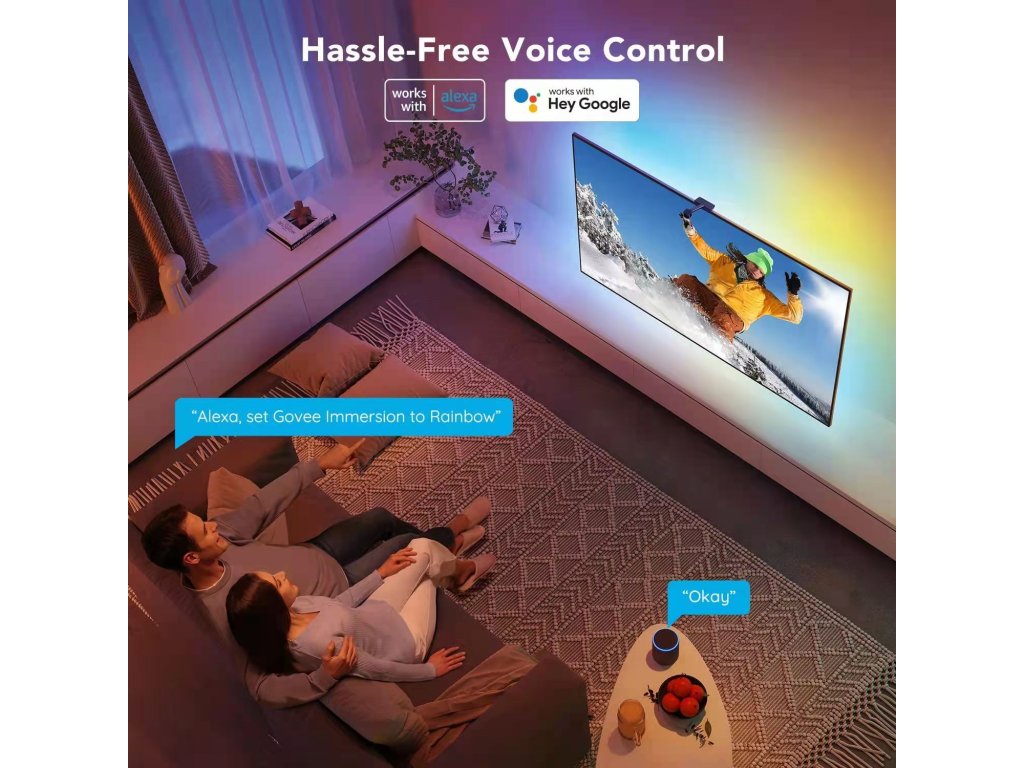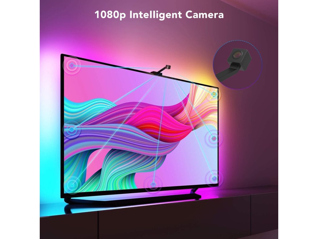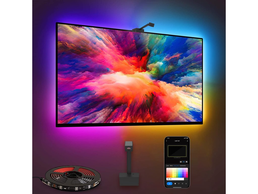 Pasek LED za monitorem z czujnikiem koloru, odpowiedni do telewizorów lub monitorów o przekątnej 55-65 cali, Wi-Fi 2,4 GHz, ściemnialny, zasilany z sieci, z aplikacjami Tuya Smart i Smart Life, kompatybilny z Asystentem Google i Amazon Alexa.