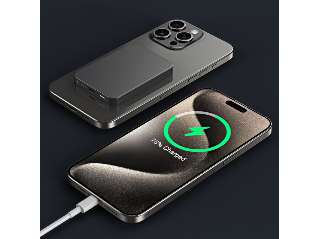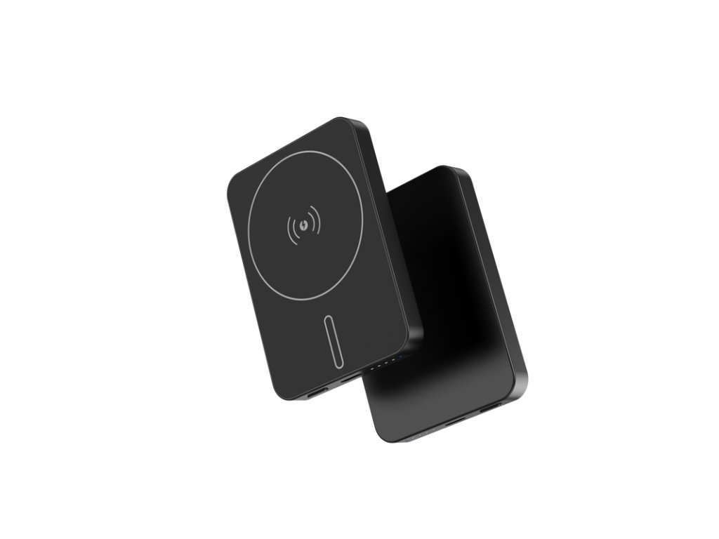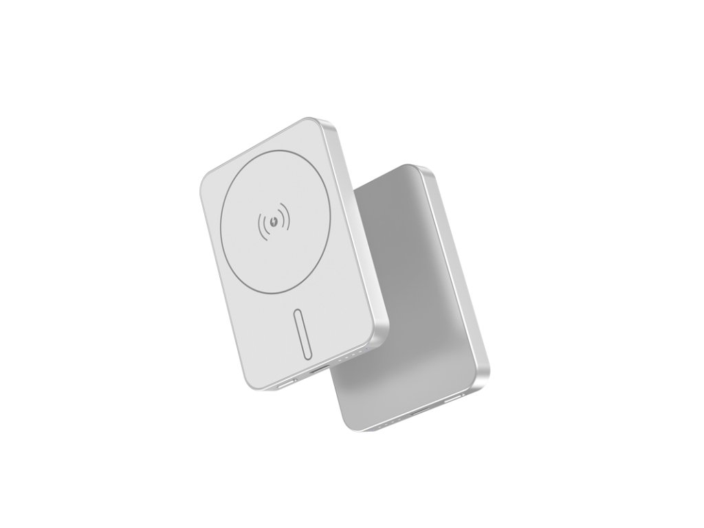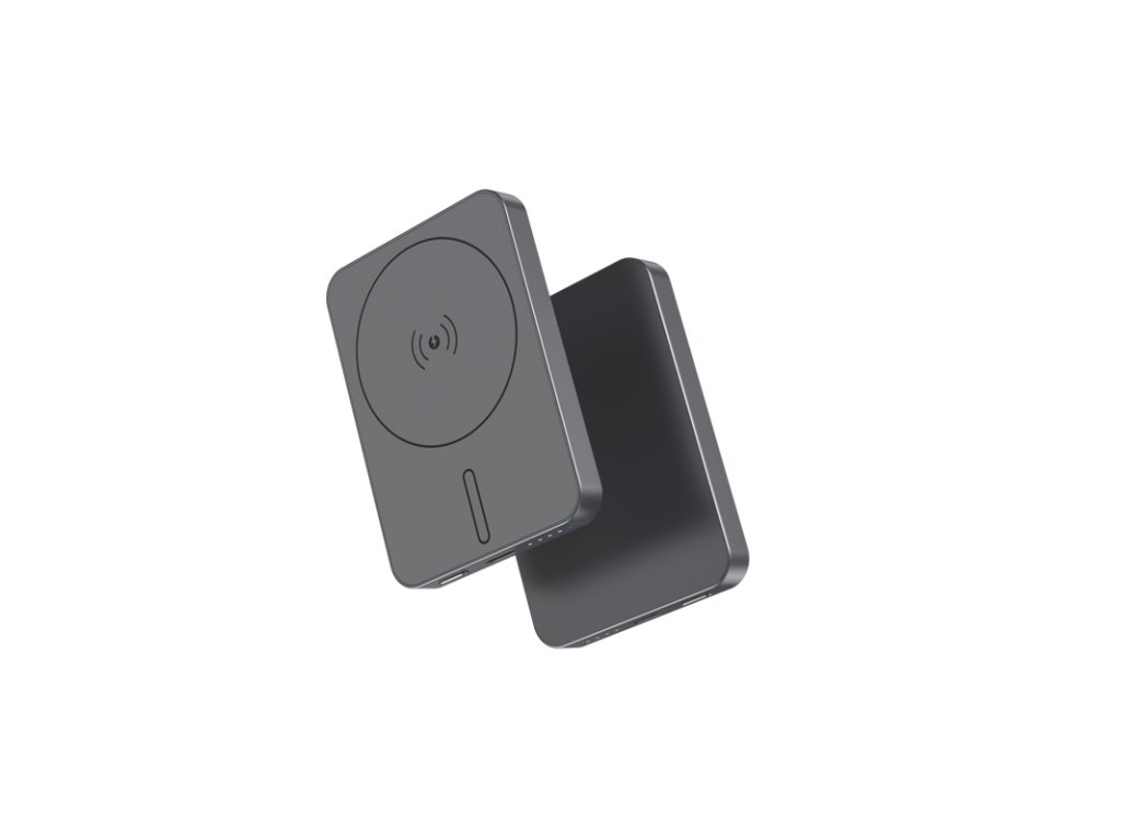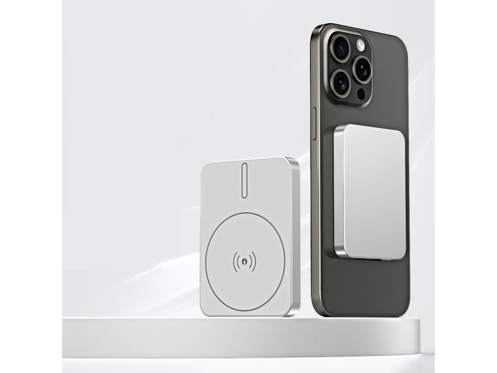 Bezprzewodowy mini powerbank, pojemność 5000 mAh, power bank do samolotów, obsługa technologii MagSafe (Apple), silny magnes, minimalistyczny design, maksymalna moc do 15 W, kolor czarny, szary lub srebrny.