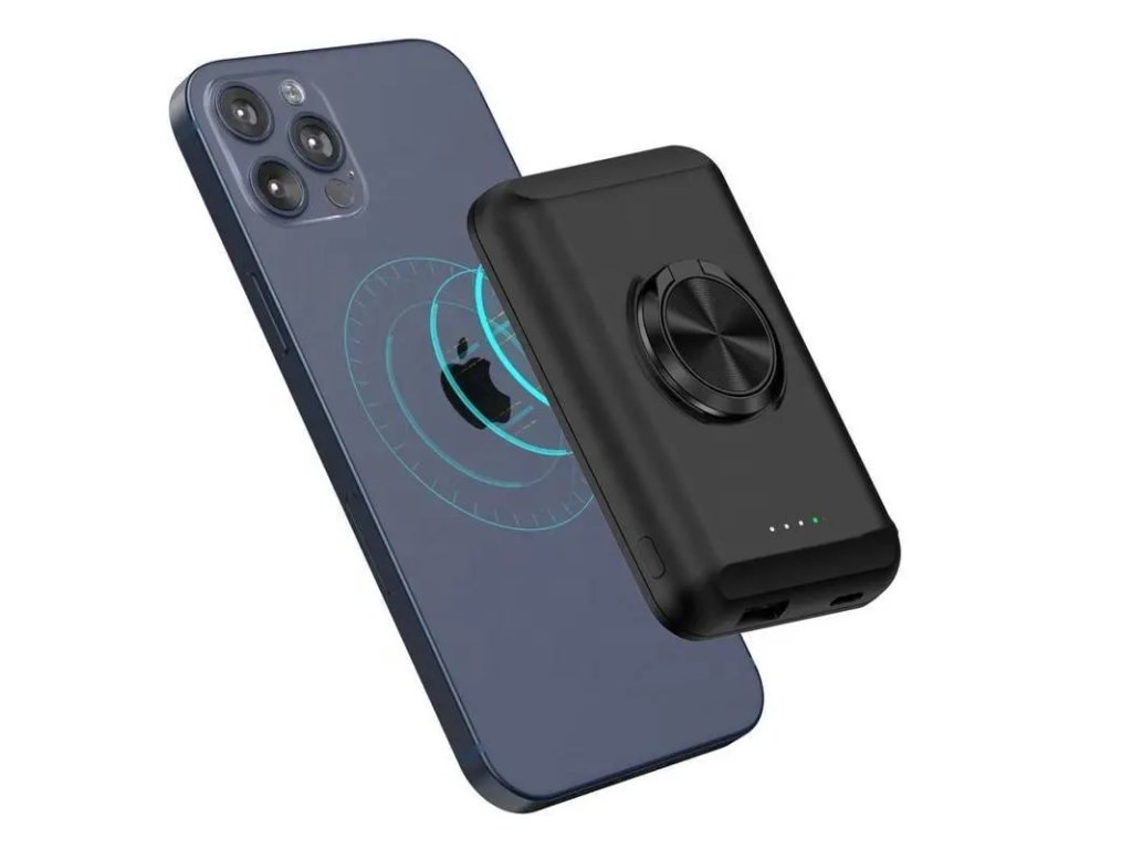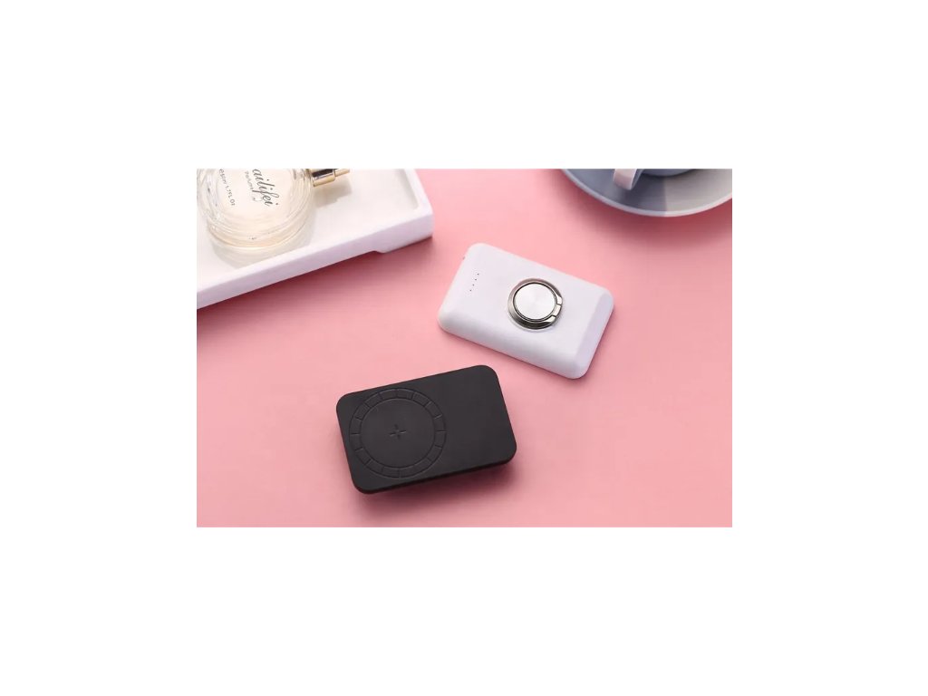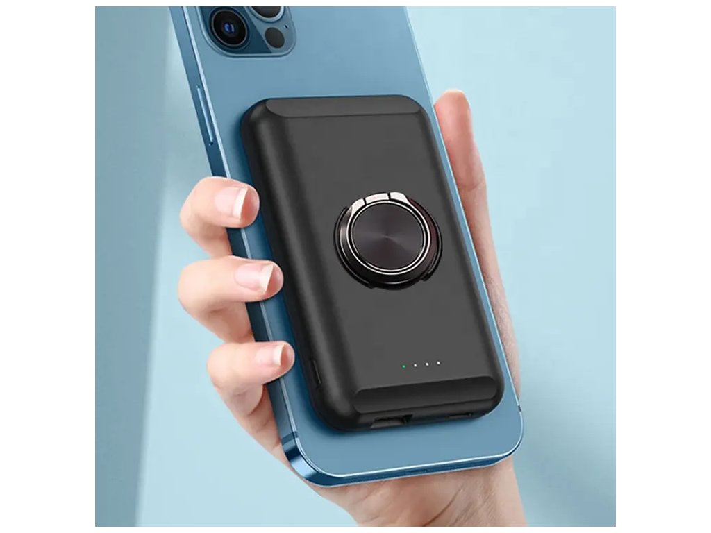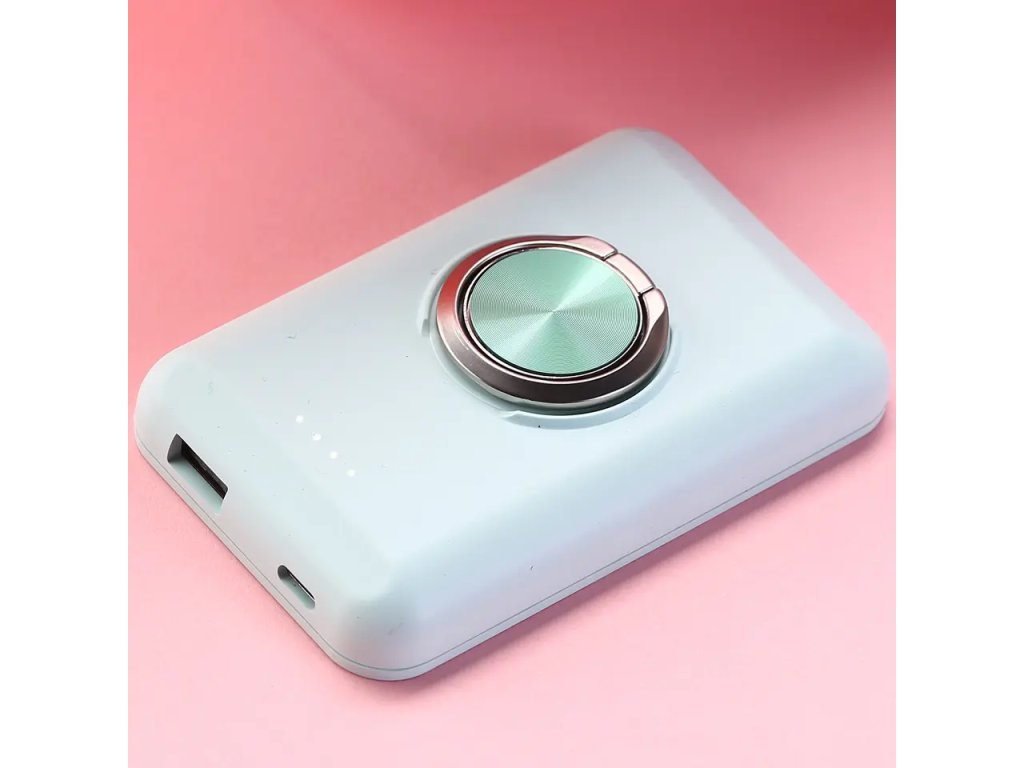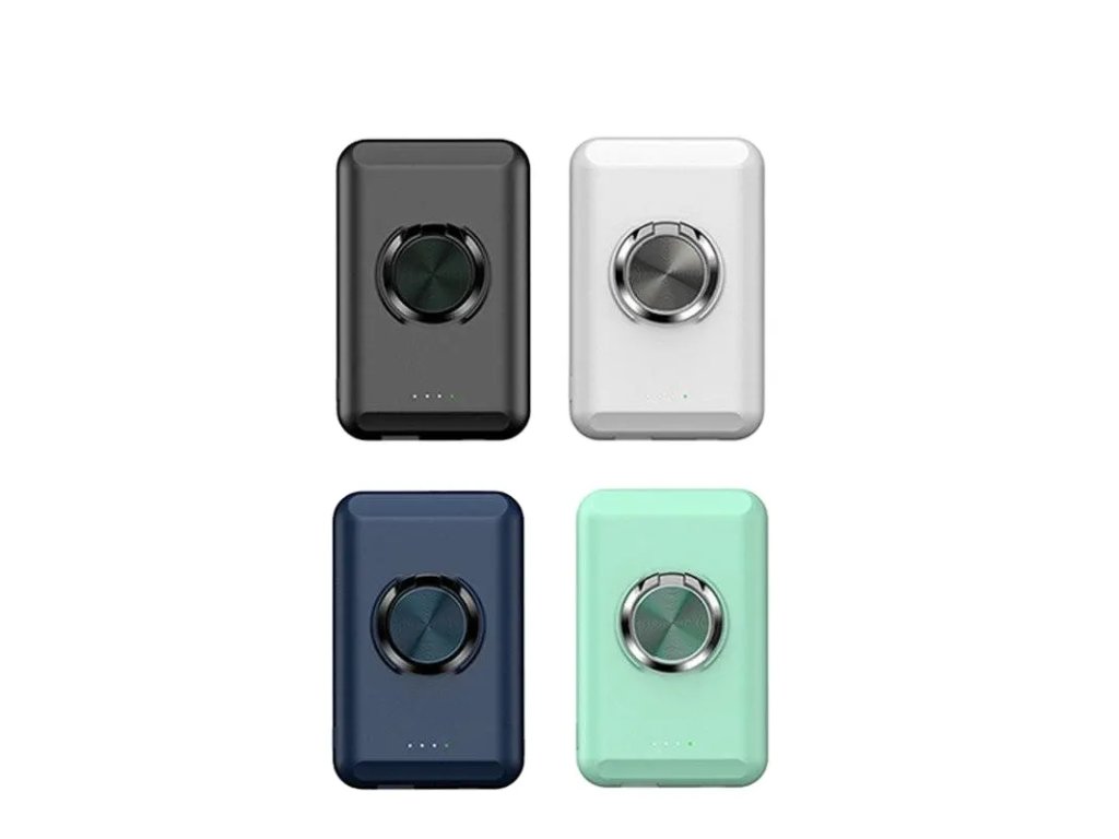 Magnetyczny bezprzewodowy power bank o pojemności 5000 mAh, power bank samolotowy, zpodstawką/pierścieniem, standardem bezprzewodowym Qi, baterią litowo-polimerową klasy A, certyfikatami FCC, CE, RoHS, UN38, MSDS, kolor: czarny, biały, niebieski i zielony