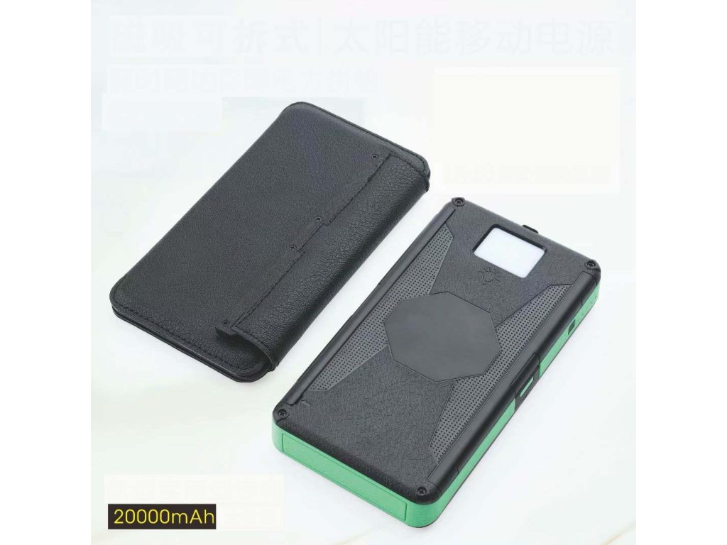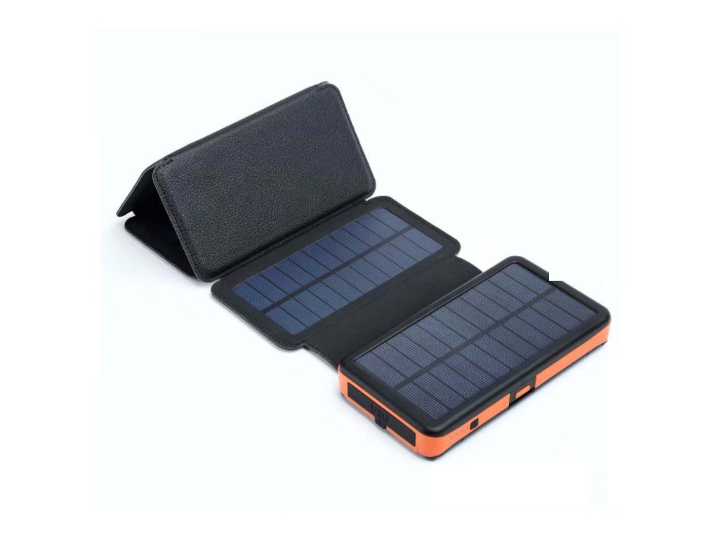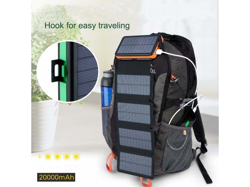 Power bank solarny składa się z dwóch akumulatorów polimerowych o łącznej pojemności 20 000 mAh. Za pomocą 4 diod LED można monitorować pozostały poziom naładowania power banku. Dzięki dwóm wejściom USB możliwe jest jednoczesne podłączenie dwóch urządzeń. Dzięki przemyślanej konstrukcji power bank solarny posiada łącznie 5 paneli słonecznych. Produkt idealnie sprawdza się w podróży, gdy nie ma dostępu do sieci elektrycznej. Nawet z 5 panelami power bank solarny można łatwo przymocować do plecaka lub plecaka i w ten sposób bezpłatnie wykorzystać energię słoneczną do ładowania telefonu komórkowego, tabletu, aparatu itp. Dodatkowym atutem jest bezprzewodowe ładowanie na powierzchni power banku. Dodatkowo z przodu znajduje się reflektor, który może świecić w różnych trybach, takich jak SOS.