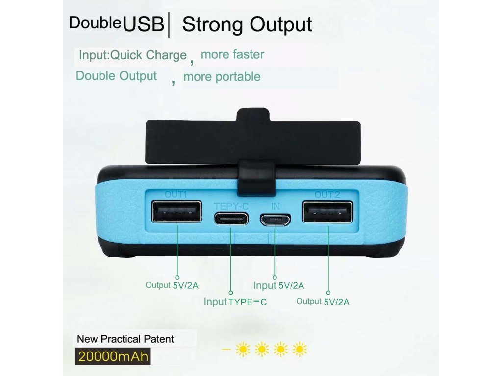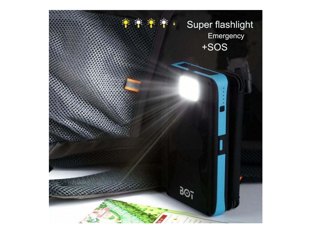 Bank energii słonecznej BOT to idealny towarzysz podróży i turystyki. Można go łatwo przymocować do plecaka lub plecaka i ładować energią słoneczną, gdy nie ma dostępu do gniazdka. Dzięki dużej pojemności powerbanku 20 000 mAh, można w pełni naładować telefon komórkowy nawet 8,5 raza.