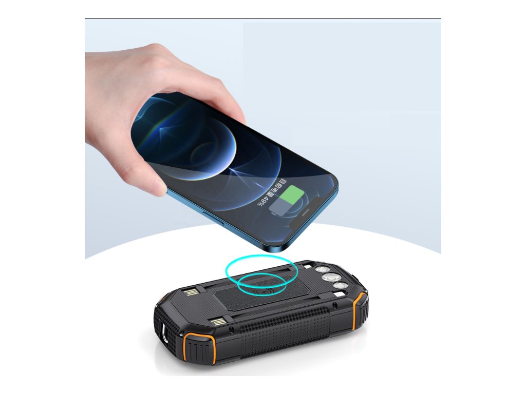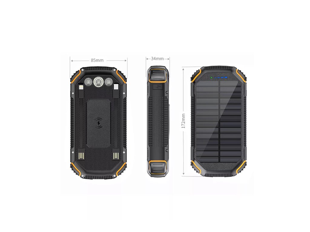 Power bank solarny o pojemności 20 000 mAh, power bank samolotowy, latarka LED, baterie litowo-polimerowe klasy A, certyfikaty FCC, CE, RoHS, ochrona przed wodą IP67, kolory: czarny, niebieski, zielony, pomarańczowy