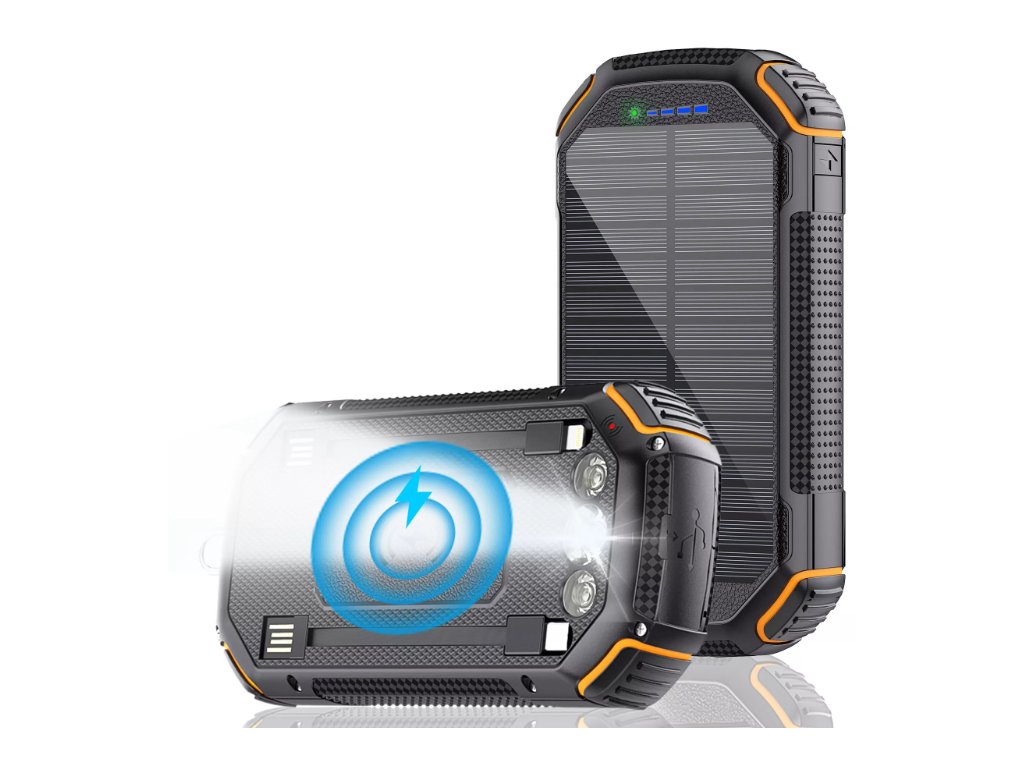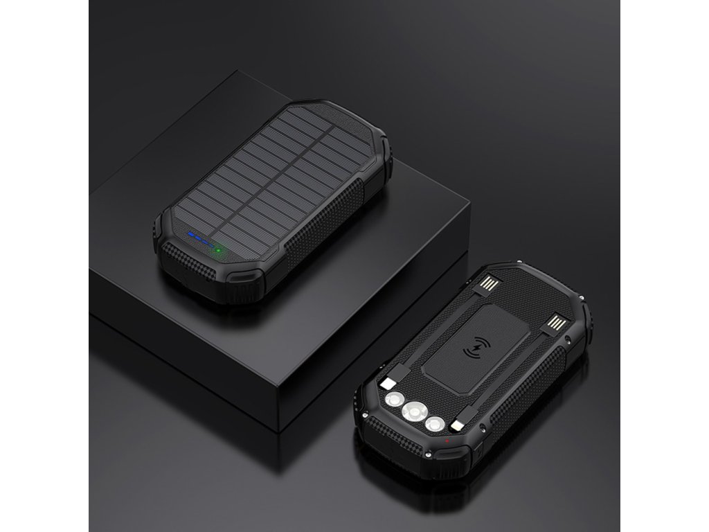 Power bank solarny składa się z akumulatorów litowo-polimerowych o łącznej pojemności 20 000 mAh. Za pomocą 4 diod LED można monitorować pozostały poziom naładowania power banku. Dzięki dwóm wejściom USB możliwe jest jednoczesne podłączenie dwóch urządzeń. Produkt sprawdzi się również w podróży, ponieważ posiada wodoodporność IP67. Dodatkowo na spodzie znajduje się latarka LED, która może świecić w różnych trybach, takich jak SOS.