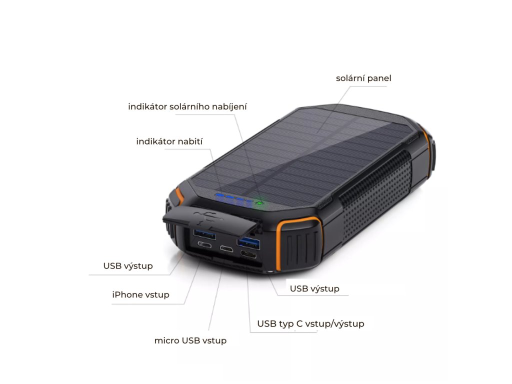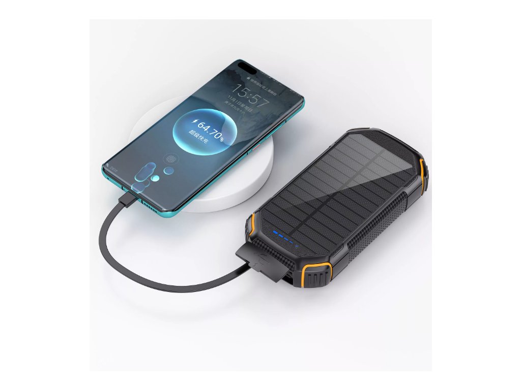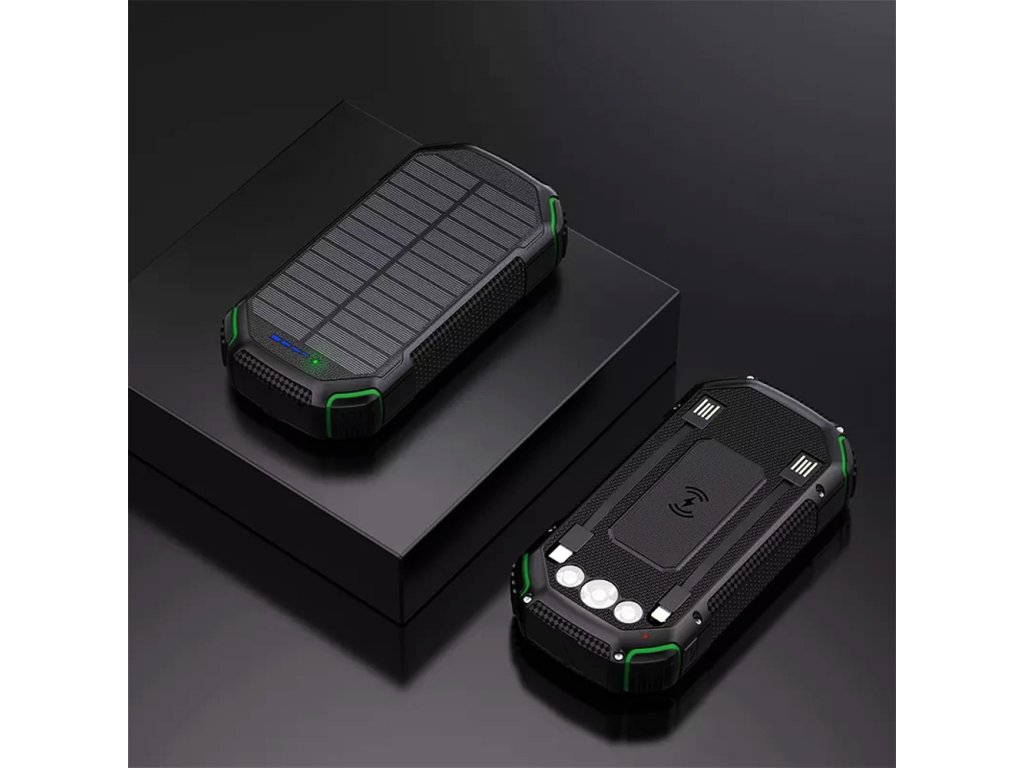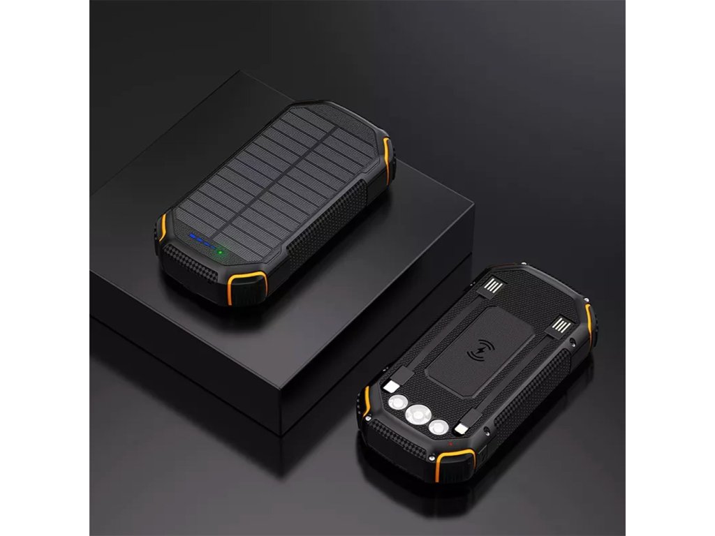 Power bank solarny składa się z akumulatorów litowo-polimerowych o łącznej pojemności 30 000 mAh. Za pomocą 4 diod LED można monitorować pozostały poziom naładowania power banku. Dzięki dwóm wejściom USB możliwe jest jednoczesne podłączenie dwóch urządzeń. Produkt sprawdzi się również w podróży, ponieważ posiada wodoodporność IP67. Dodatkowo na spodzie znajduje się latarka LED, która może świecić w różnych trybach, takich jak SOS.