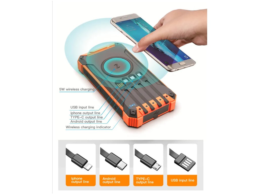 - Zintegrowane kable: 4 x kabel USB z 4 końcówkami (iPhone, USB-C, micro USB, USB-A)