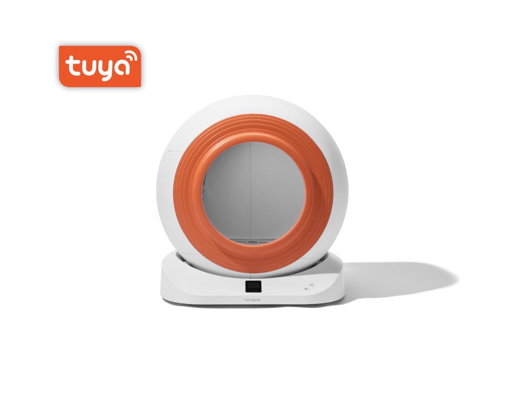 Samoczyszcząca toaleta dla kotów, WiFi 2,4 GHz, aplikacja mobilna Tuya Smart/Smartlife, wymiary 48 x 52 x 50,5 cm, zasilanie sieciowe, pojemność toalety 65 litrów, biało-pomarańczowy design.