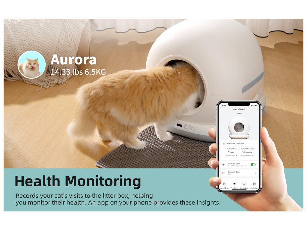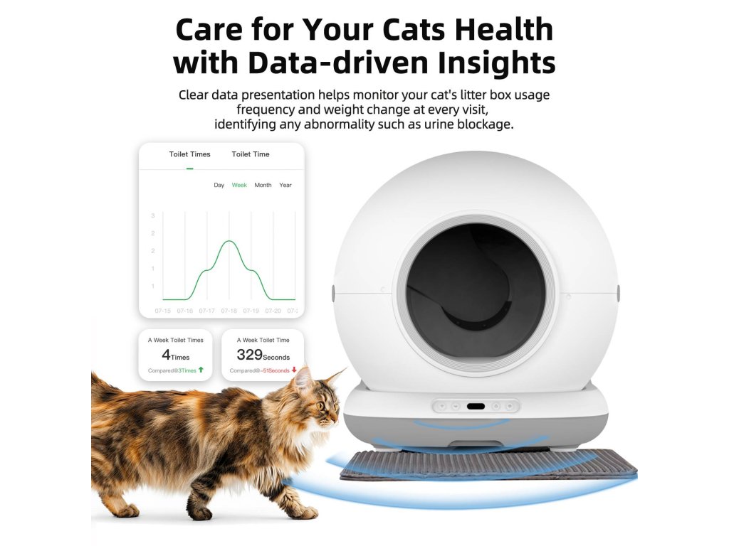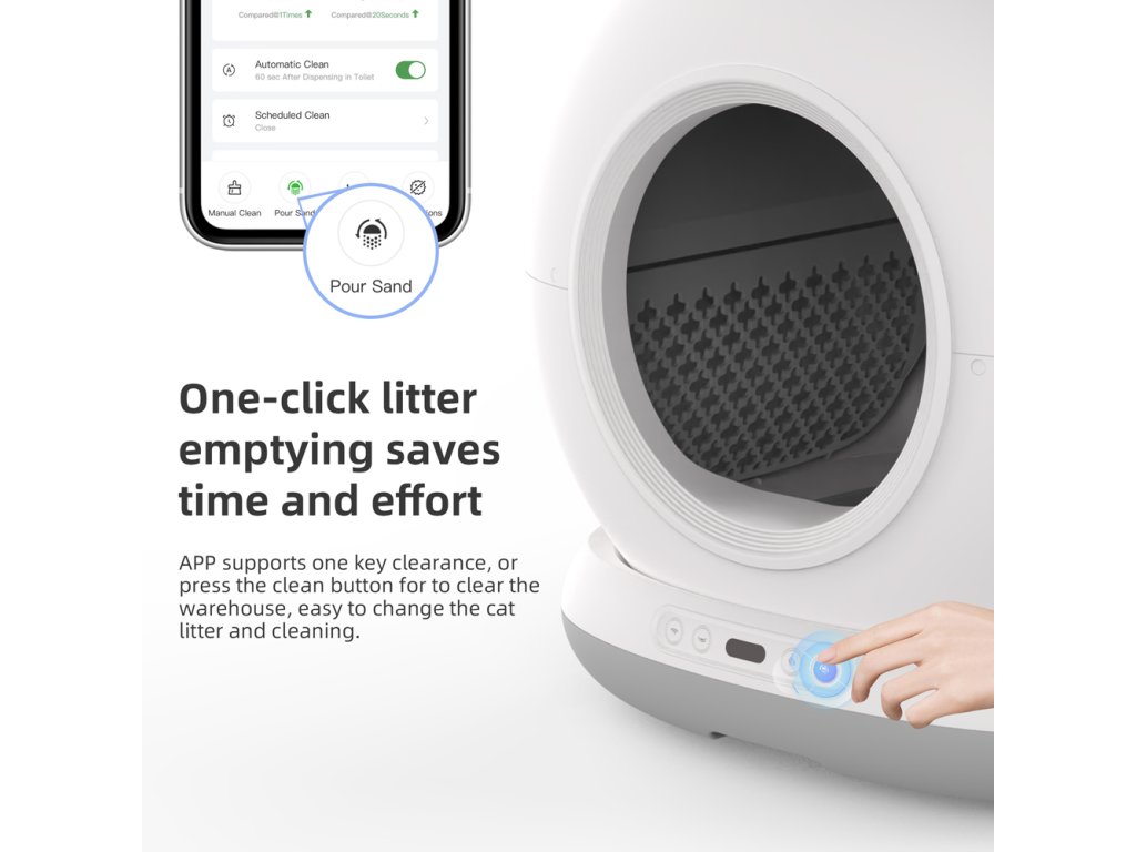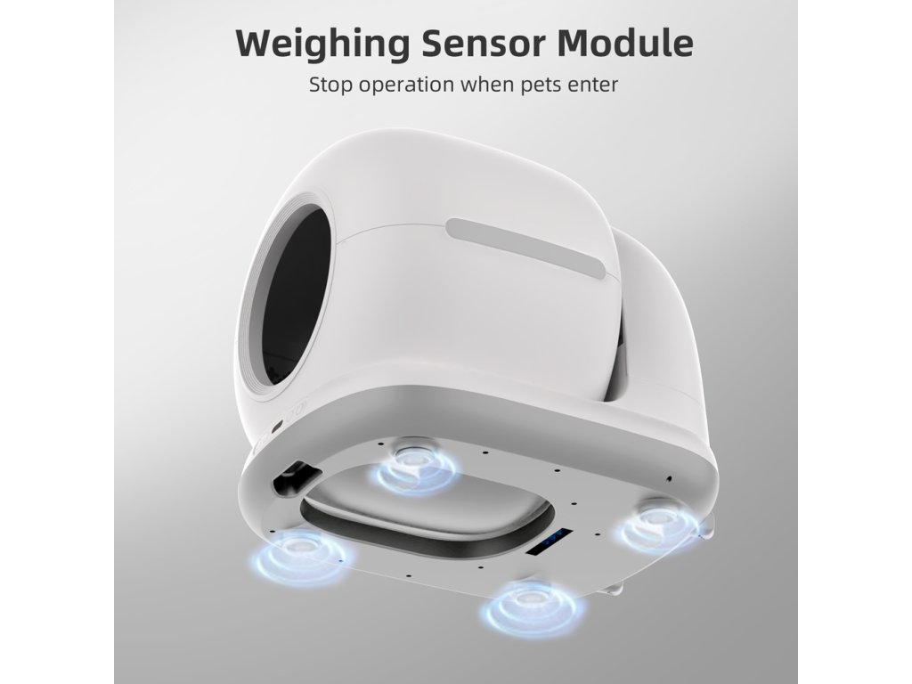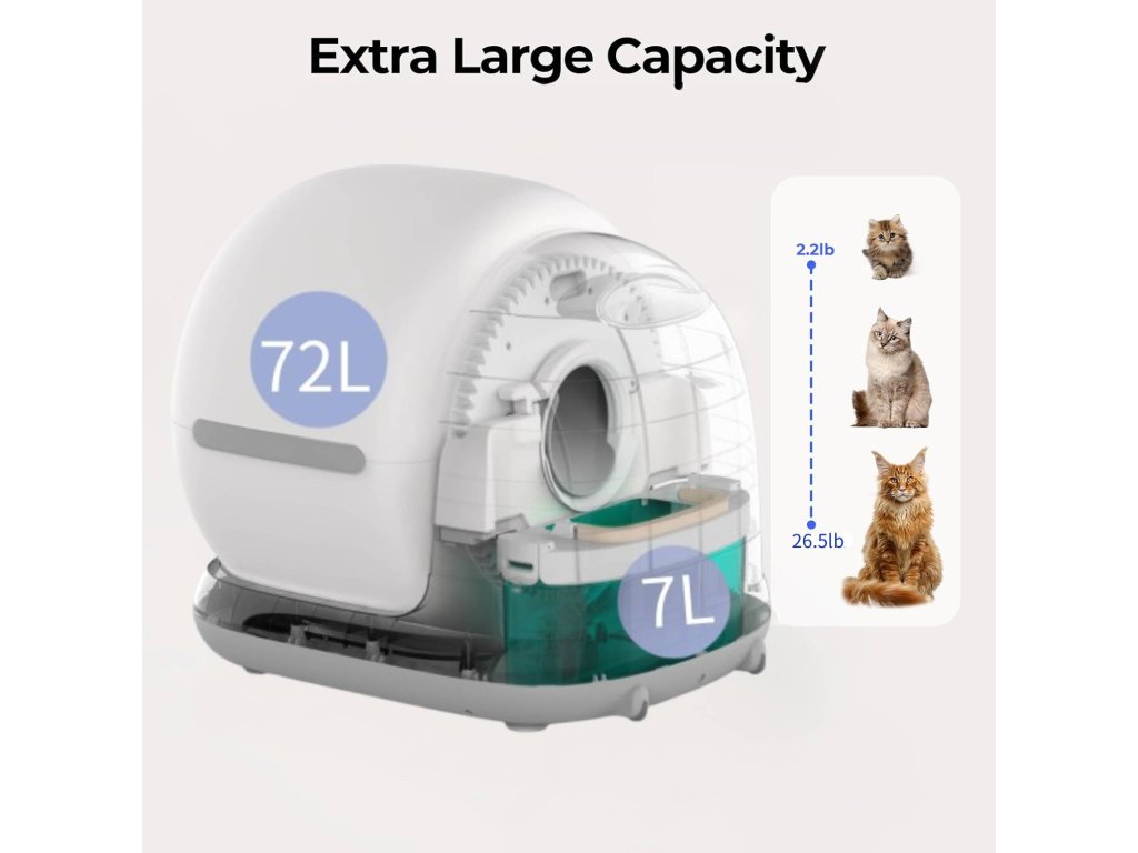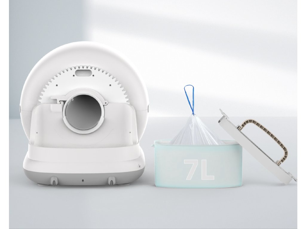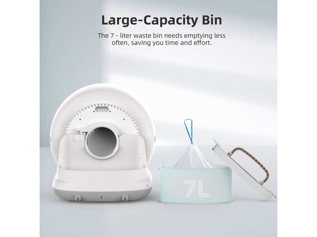 Utrzymanie toalety jest proste. Pojemnik na odpady o pojemności 7 litrów pozwala na działanie nawet do 15 dni bez konieczności opróżniania. Funkcja jednego przycisku do całkowitego opróżnienia pojemnika oraz zintegrowany system dezodoryzacji zapewniają czyste i bezzapachowe otoczenie. Wymiana żwirku to kwestia kilku kliknięć – bezpośrednio na urządzeniu lub zdalnie przez aplikację mobilną. Aplikacja dodatkowo umożliwia podgląd częstotliwości korzystania z toalety oraz zmian wagi kota, co pomaga wcześnie wykryć ewentualne problemy zdrowotne.