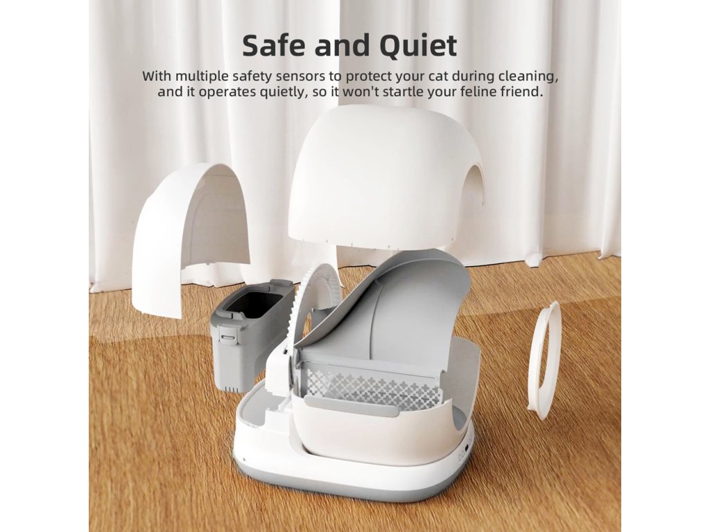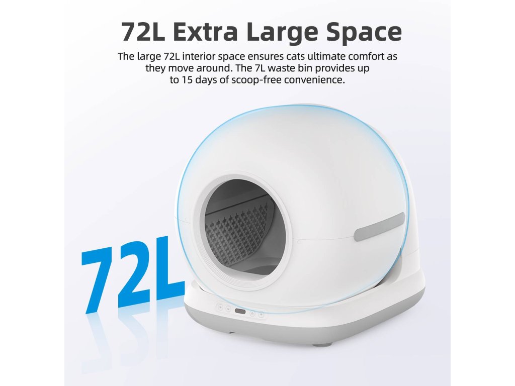 Samoczyszcząca toaleta dla kotów BOT SCL2 to nowoczesne rozwiązanie higieniczne dla kocich domów. Dzięki pojemności 72 litrów zapewnia wystarczająco dużo miejsca nawet dla większych kotów, a jednocześnie zajmuje minimum przestrzeni w mieszkaniu. Nowoczesna konstrukcja gwarantuje komfort przy każdej wizycie w toalecie, a cicha praca nie wywołuje stresu u zwierzęcia. Toaleta jest wyposażona w czujniki ruchu i wagi, które bezpiecznie rozpoznają, kiedy kot znajduje się w środku lub w pobliżu – urządzenie automatycznie się dostosowuje, aby zapewnić maksymalne bezpieczeństwo.