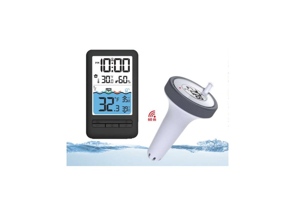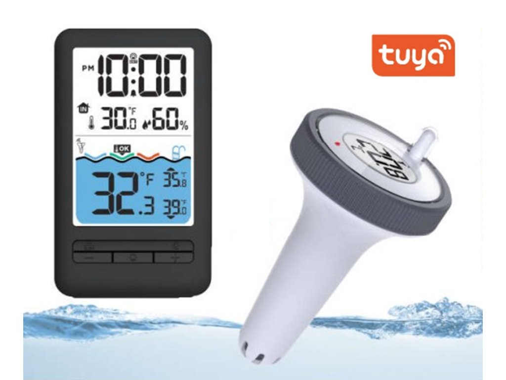 Inteligentny termometr cyfrowy przeznaczony do basenów i oczek wodnych, zdalna transmisja danych pomiarowych, Wi-Fi, aplikacja mobilna Tuya Smart, zasięg do 60 metrów, wskaźniktemperatury wody i temperatury wewnętrznej, jednostki: stopnie Celsjusza(°C) i stopnie Fahrenheita (°F), zasilanie bateryjne (AAA), czarny design.