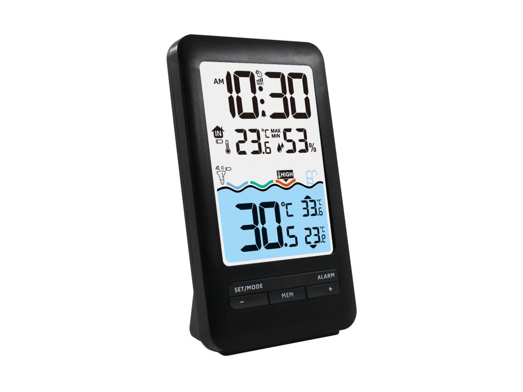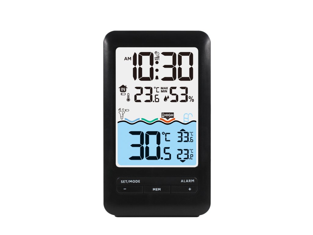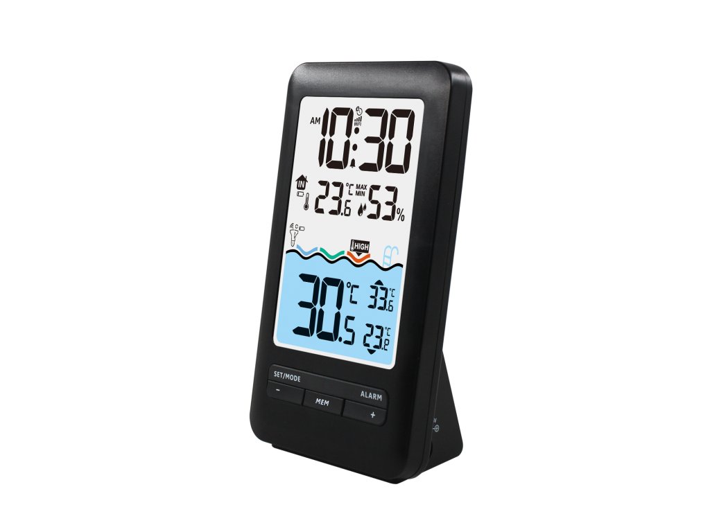- Wyświetlacz temperatury wody, maksymalnej i minimalnej zmierzonej temperatury wody, temperatury i wilgotności w domu oraz czasu