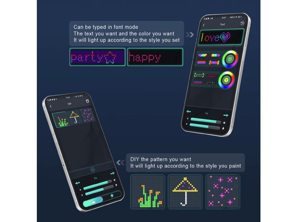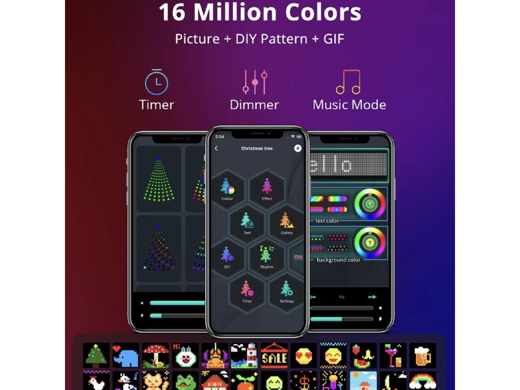 - Sterowanie aplikacją: Aplikacja mobilna Surplife pozwala łatwo ustawić kolory, stworzyć własną grafikę pikselową, wprowadzić tekst lub wybrać jedną z predefiniowanych scen.