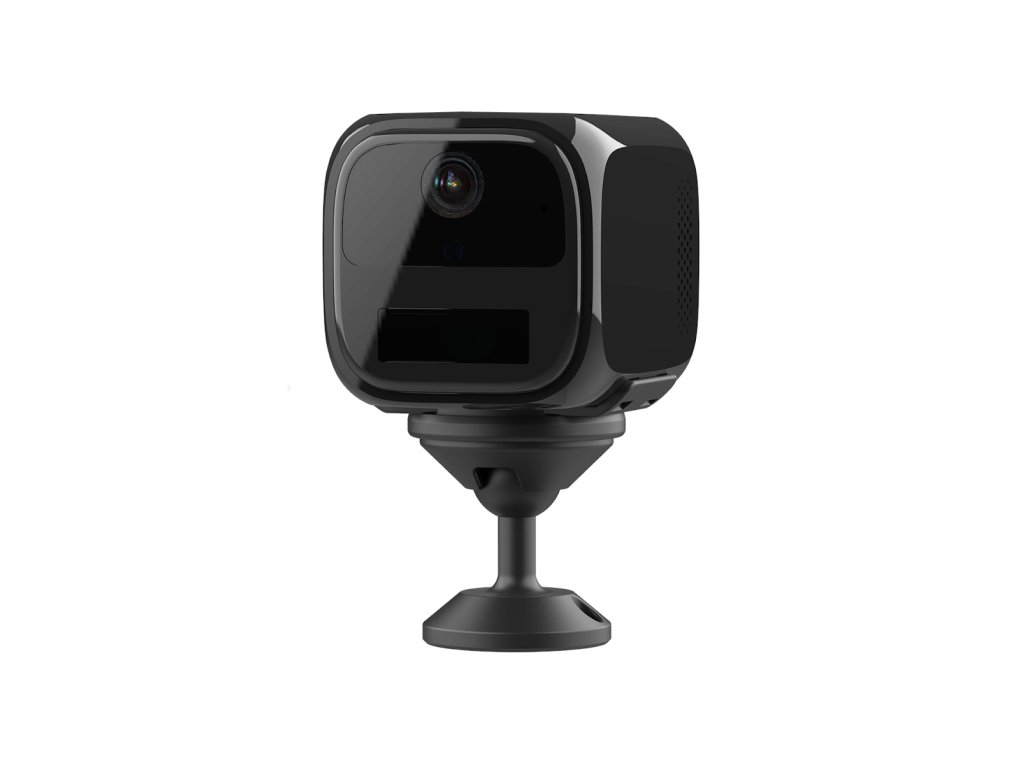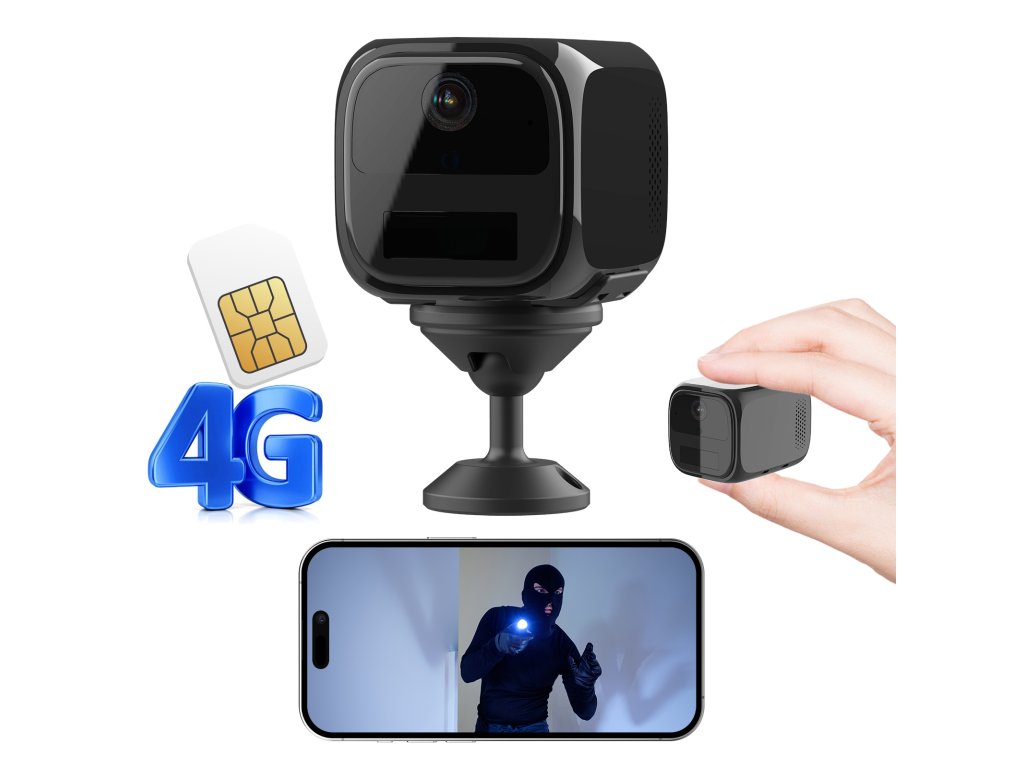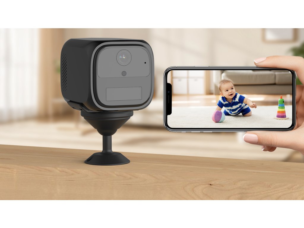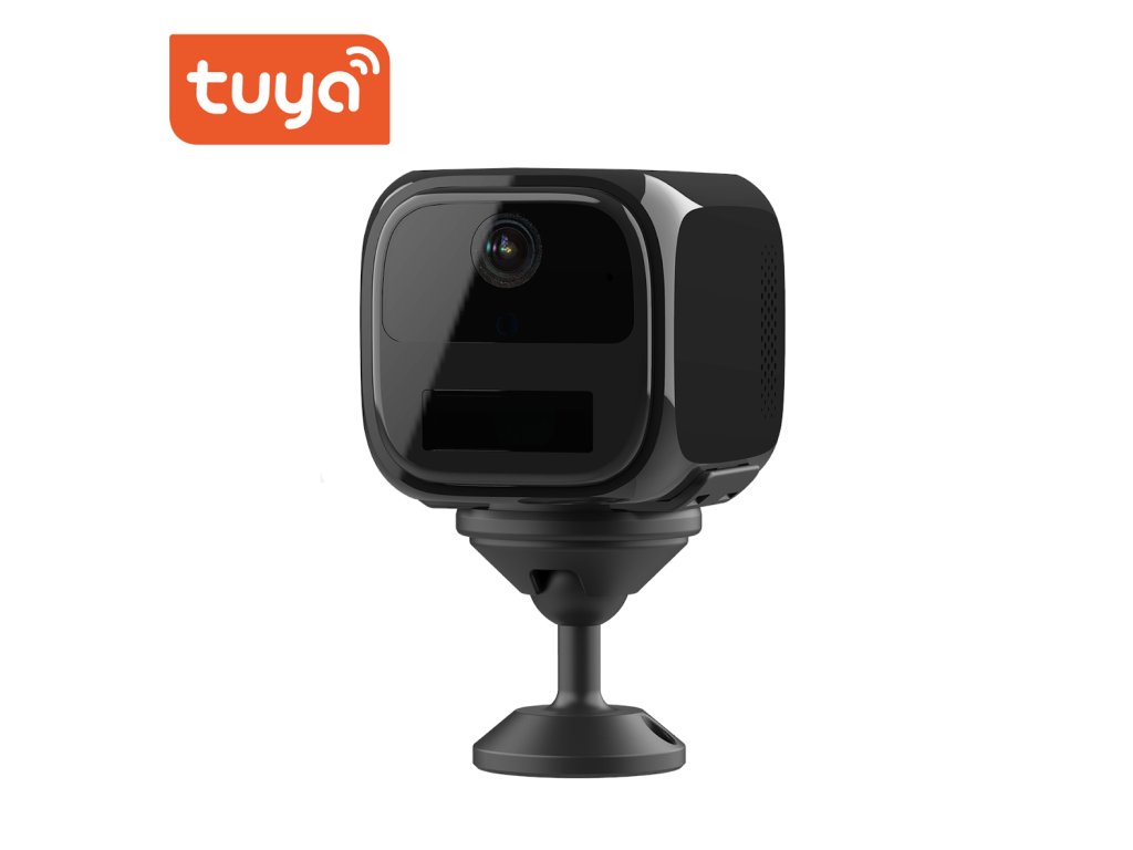 Inteligentna minikamera domowa, WiFi2,4 GHz, 4G, rozdzielczość QHD (2560 x 1440 px), aplikacja mobilna Tuya Smart, kąt widzenia 150°, widoczność w nocy do 8 metrów, bateria 2600 mAh, czarny design.