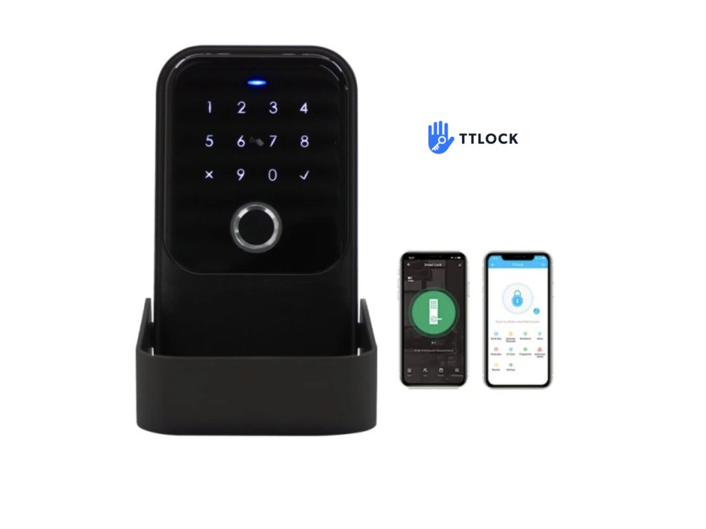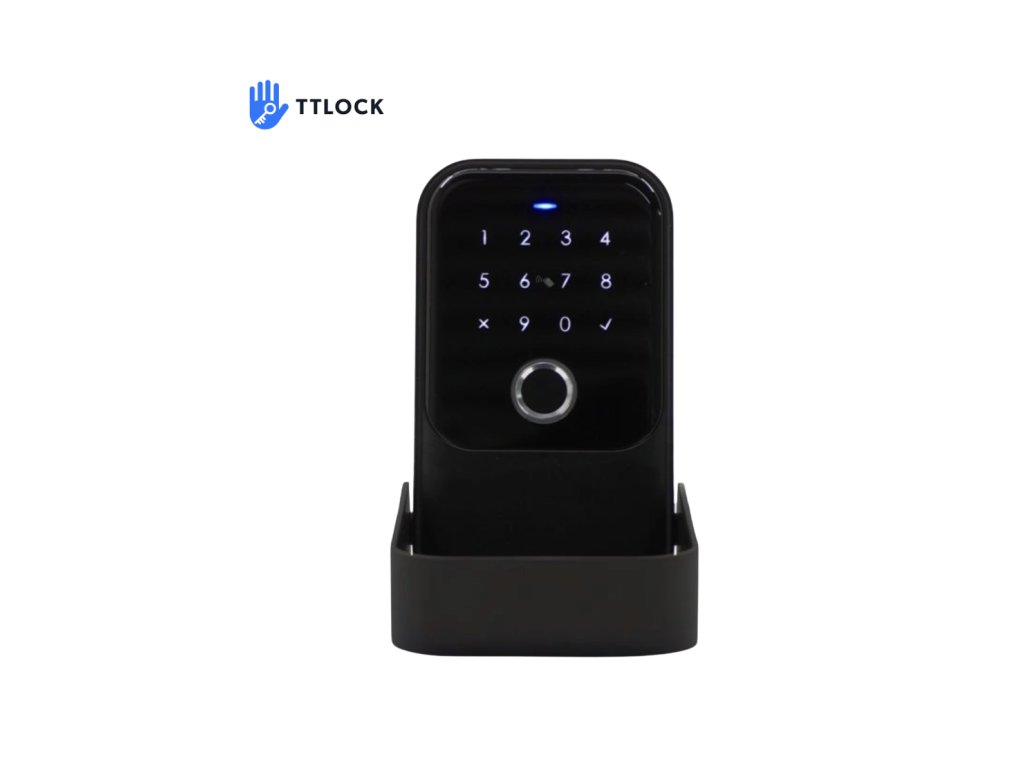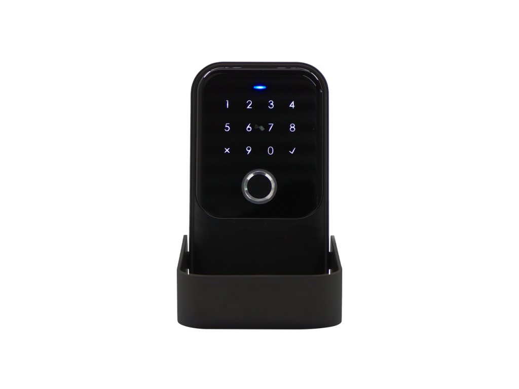 Inteligentny kluczyk, Bluetooth, zasilany bateryjnie, czytnik linii papilarnych, odblokowywanie kartą, kodem PIN lub telefonem, praca w trybie offline, rejestrowanie przyjazdów i wyjazdów, sterowanie za pomocą aplikacji TTLock, wykończenie w kolorze czarnym.