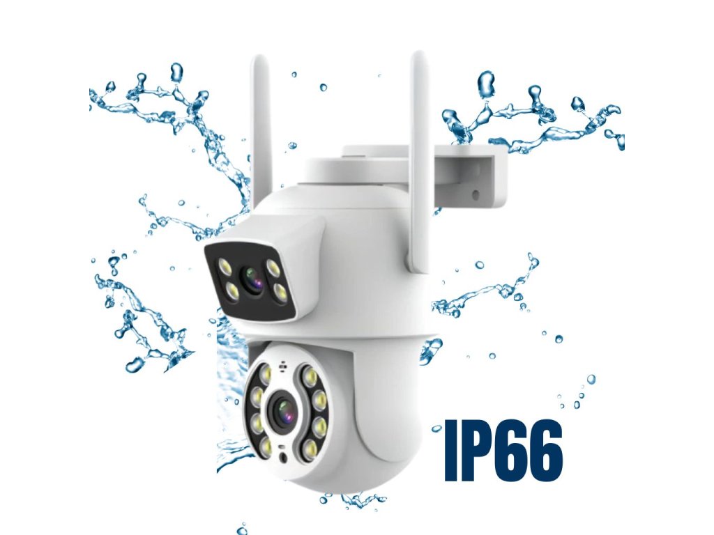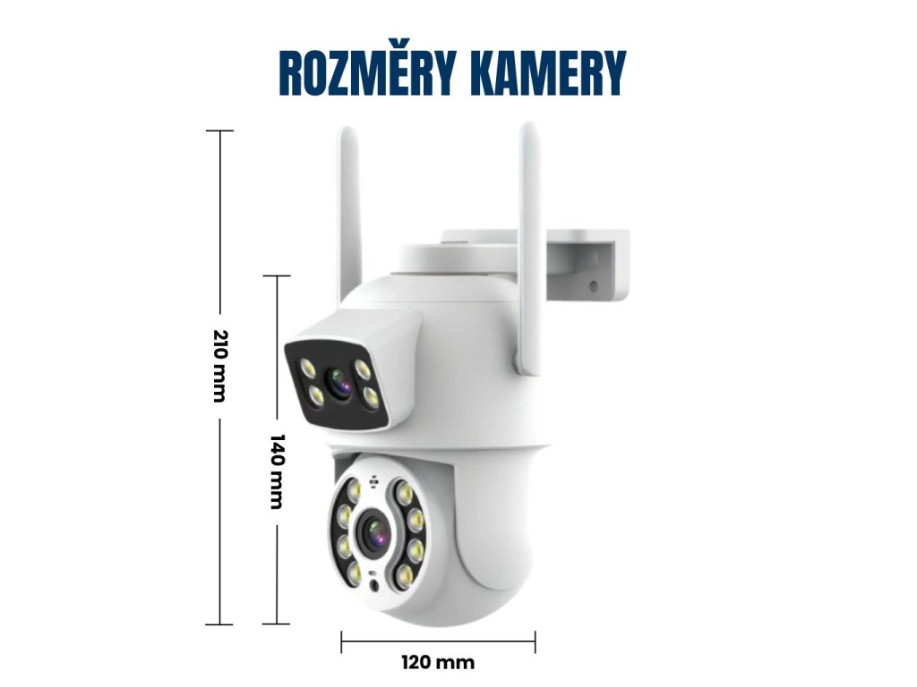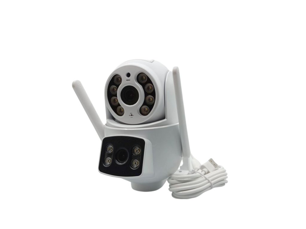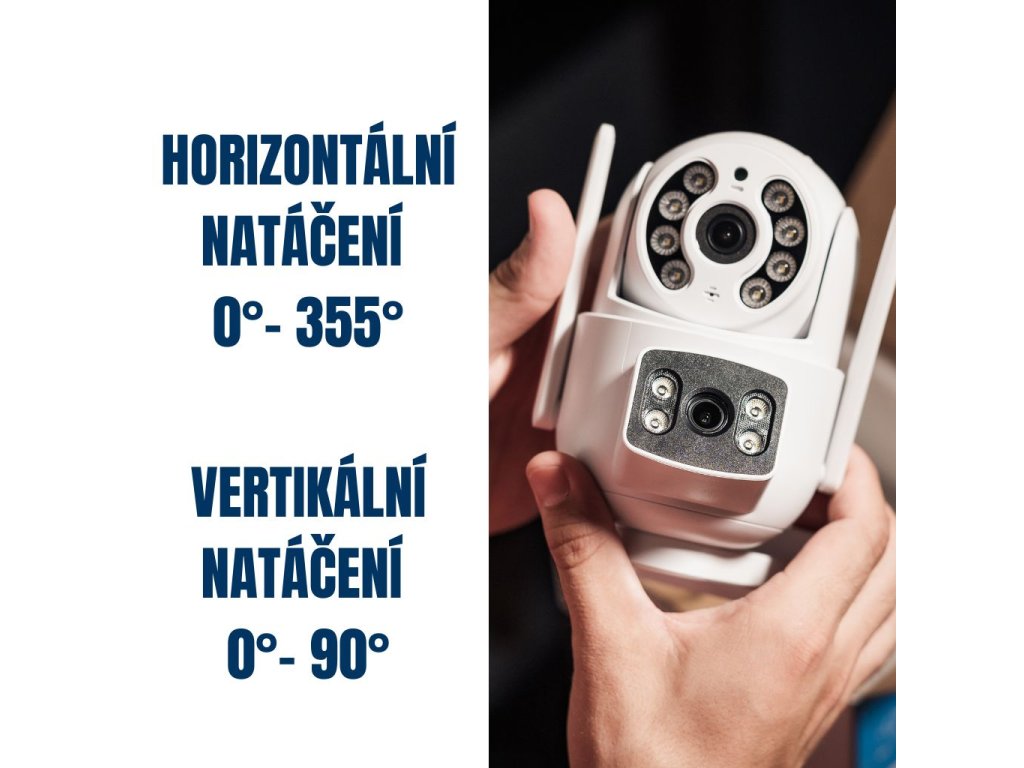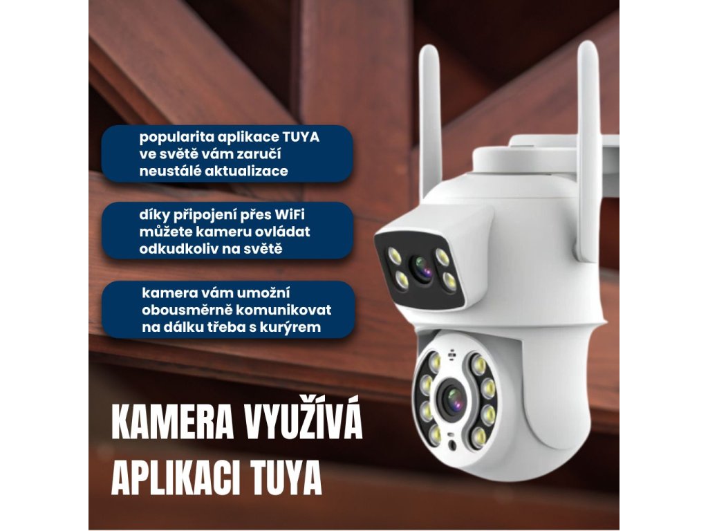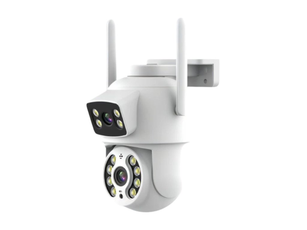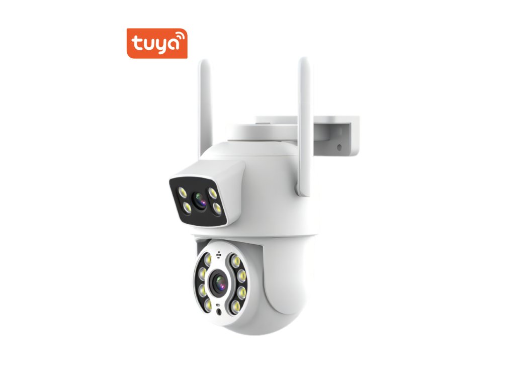 Inteligentna zewnętrzna kamera bezpieczeństwa, detekcja ruchu, Wi-Fi 3 MP (1440p), dwa czujniki 3 Mpx, pole widzenia 355°, sterowanie obrotem kamery w poziomie 0°-355° i w pionie 0°-90°, komunikacja dwustronna, aplikacja mobilna Tuya Smart/Smart Life, kolor biały.
