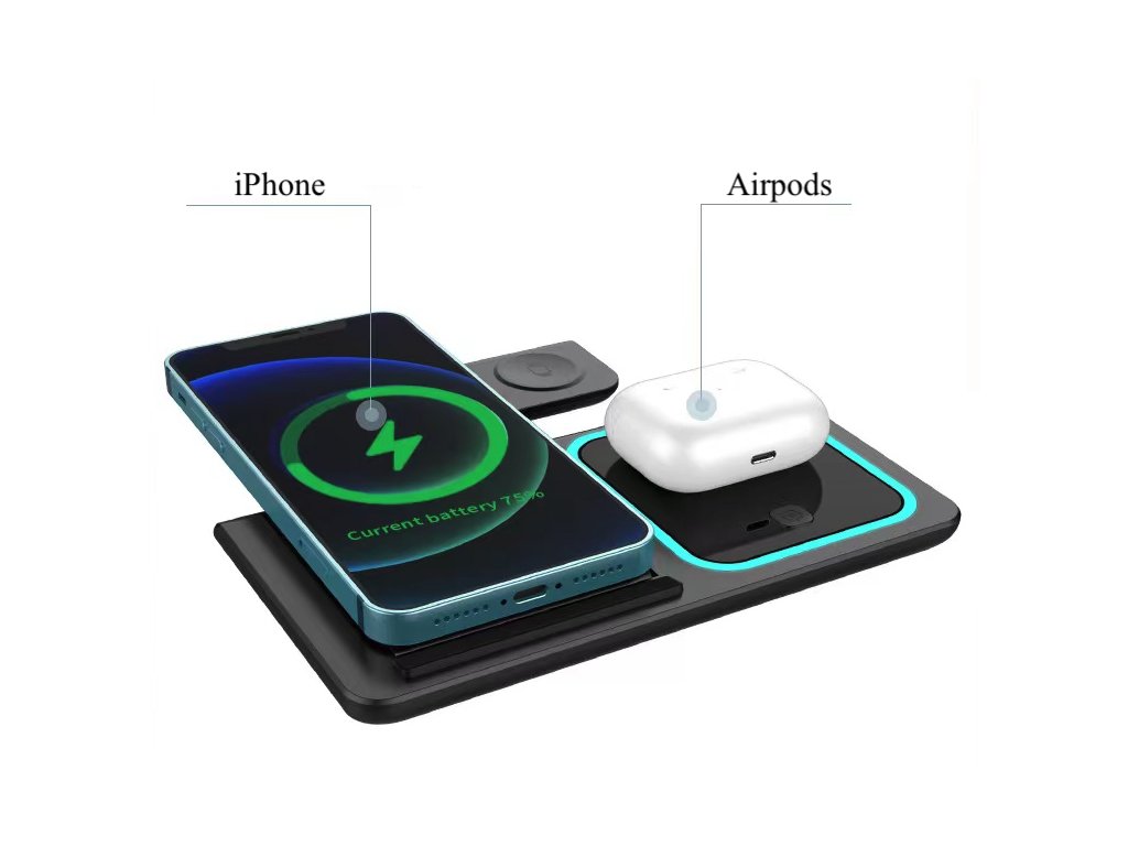 Bezprzewodowa stacja ładująca BOT wygodnie i efektywnie ładuje do trzech urządzeń jednocześnie – telefon komórkowy, smartwatch i słuchawki.Bezprzewodowa stacja ładująca APH4 posiada 3 wyjścia – 15 W, 3 W i 3 W. Jest również wyposażona w wejście USB-C dla jeszcze większej elastyczności.Oczywiście, posiada również zabezpieczenie przed zbyt niskim i zbyt wysokim napięciem, które chroni urządzenie przed ewentualnym uszkodzeniem.