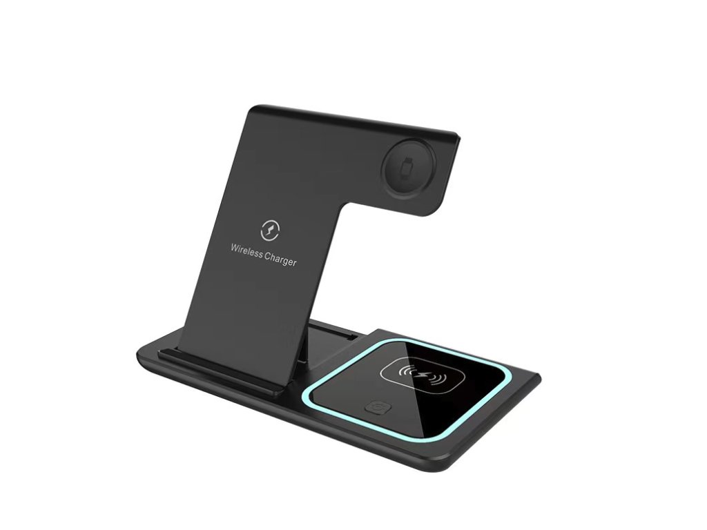 Stacja ładowania bezprzewodowego 3 w 1 z obsługą szybkiego ładowania, przeznaczona do bezprzewodowego ładowania telefonów komórkowych, zegarków i słuchawek, wejście USB-C, 3 wyjścia (15 W, 3 W i 3 W), zabezpieczenie przed niedoborem mocy i przepięciem, wersja w kolorze czarnym.