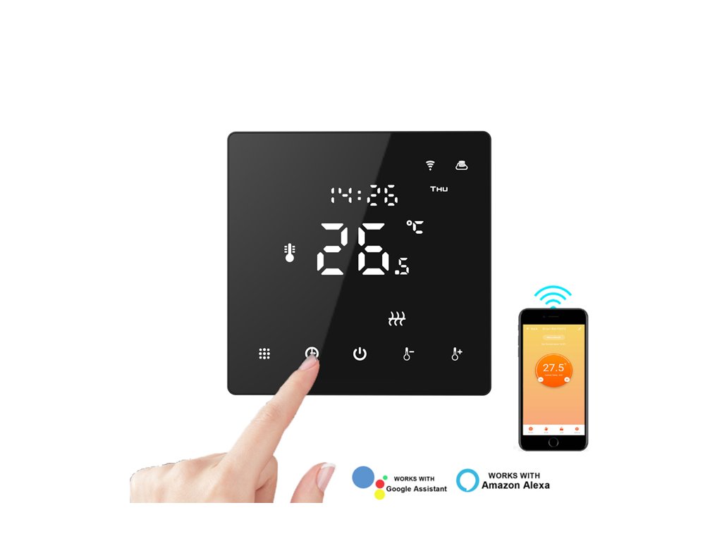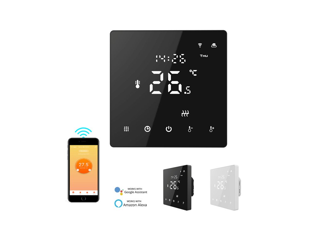 Inteligentny termostat pokojowy, wersja 16A lub 3A, WiFi, sterowanie smartfonem, wyświetlacz dotykowy, możliwość ustawienia temperatury w zakresie 10°C - 30°C, służy do regulacji: systemu grzewczego, kotła, bojlera i innych, aplikacja mobilna Tuya Smart / Smart Life, kompatybilny z Asystentem Google, Amazon Alexa, wersja czarna lub biała.