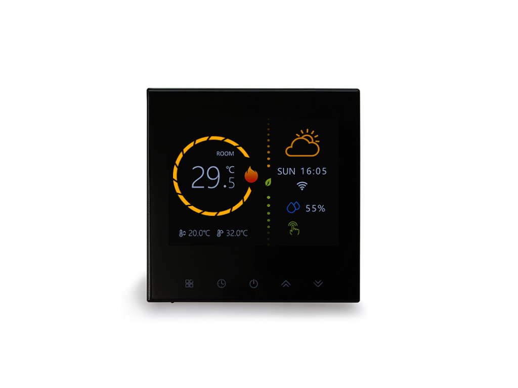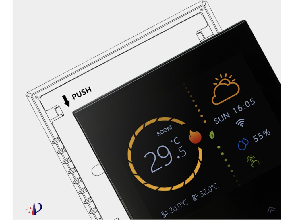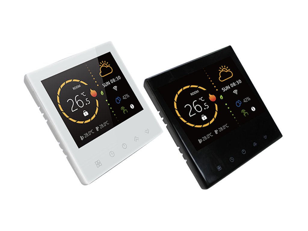 3,5-calowy wyświetlacz dotykowy TFT zapewnia przejrzystą i intuicyjną obsługę. Wyświetlacz wyświetla jednocześnie aktualną temperaturę w pomieszczeniu, ustawioną temperaturę docelową oraz warunki zewnętrzne – w tym pogodę i wilgotność. Dzięki eleganckiemu wzornictwu w kolorze białym lub czarnym oraz cienkiemu profilowi (tylko 11 mm) termostat pasuje do każdego wnętrza.