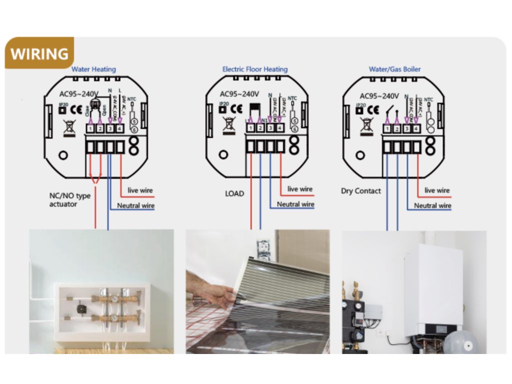 Inteligentny termostat pokojowy, WiFi 2,4 GHz, opcja 16 A lub 3 A, wyświetlacz dotykowy, możliwość ustawienia temperatury w zakresie od 5°C do 35°C, służy do regulacji: systemu ogrzewania, kotła, kotła i innych, aplikacja mobilna Tuya Smart / Smart Life, kompatybilny z Asystentem Google, Amazon Alexa, biały lub czarny design.