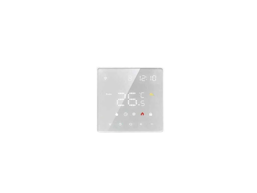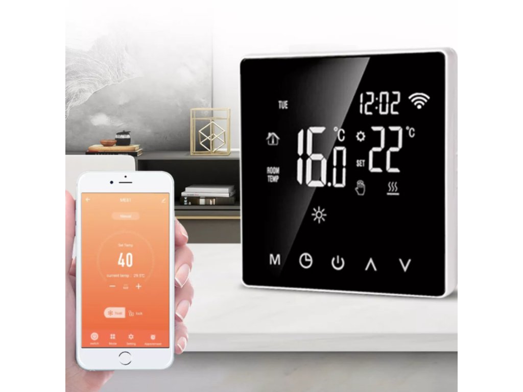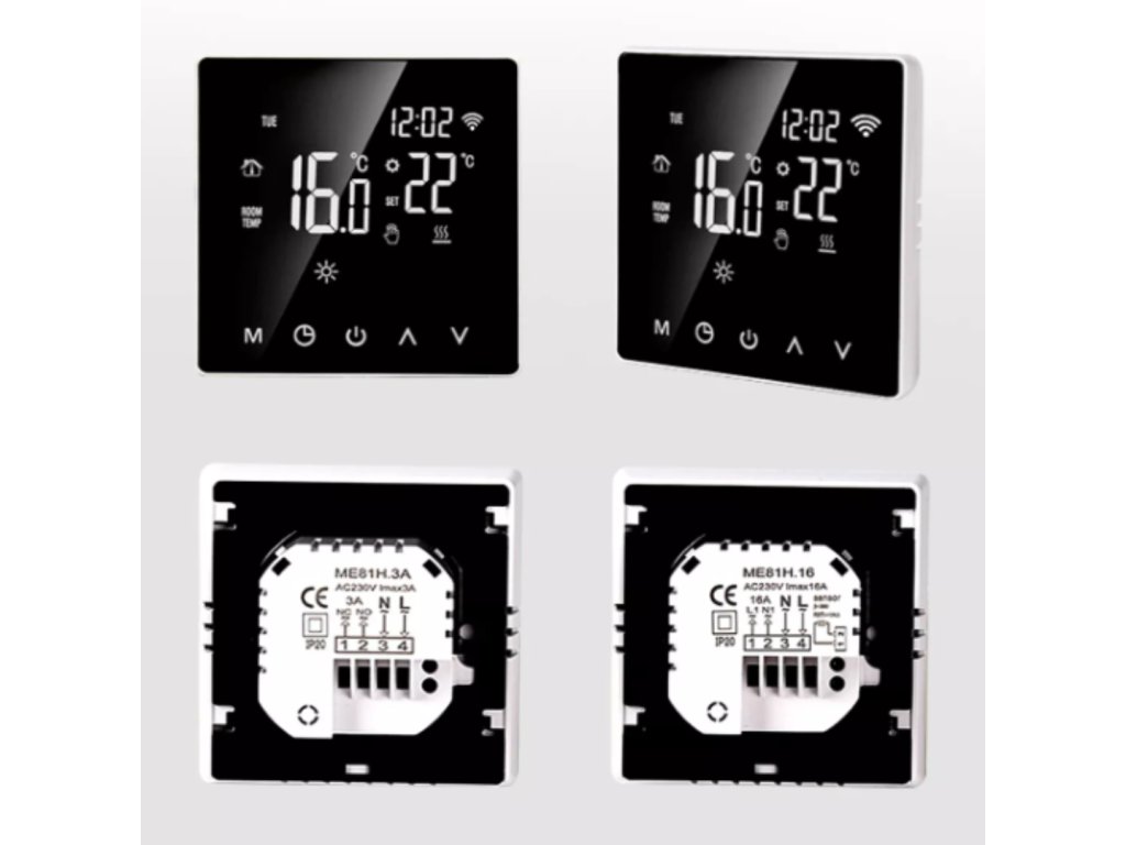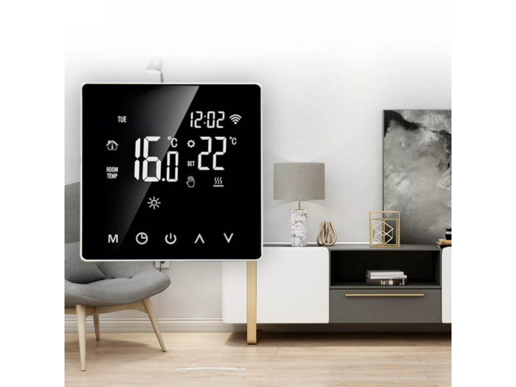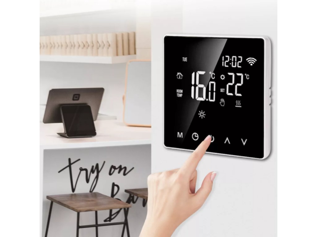 Inteligentny termostat pokojowy, wariant 16A lub 3A, Wi-Fi, sterowanie smartfonem, wyświetlacz dotykowy, możliwość ustawienia temperatury w zakresie 10°C - 30°C, do regulacji: ogrzewania, kotła, bojlera i innych, aplikacja mobilna Tuya Smart / Smart Life, kompatybilny Asystent Google, Amazon Alexa.