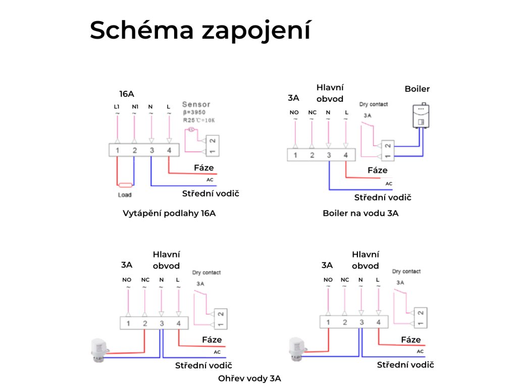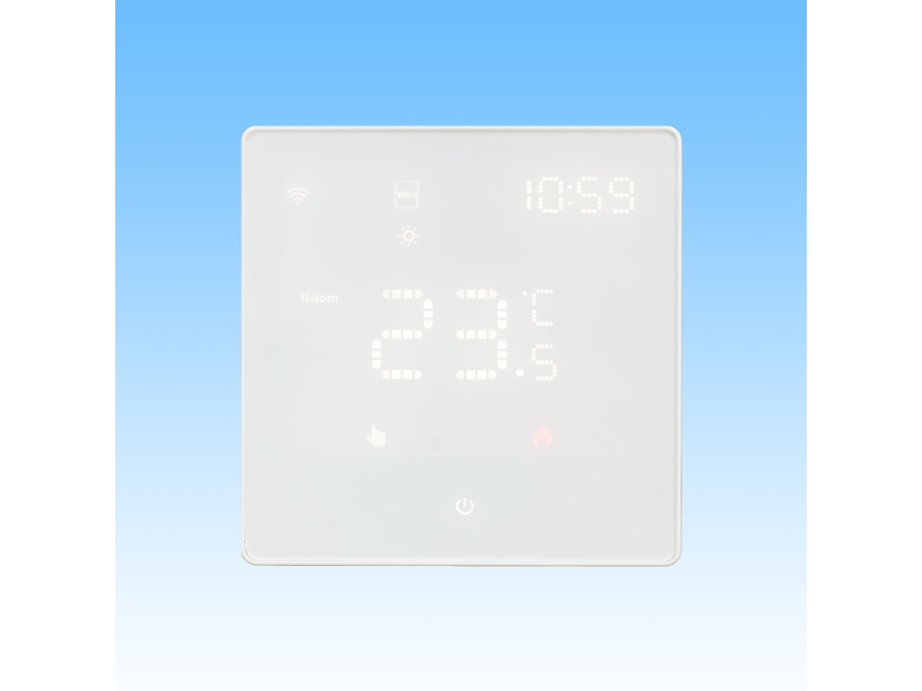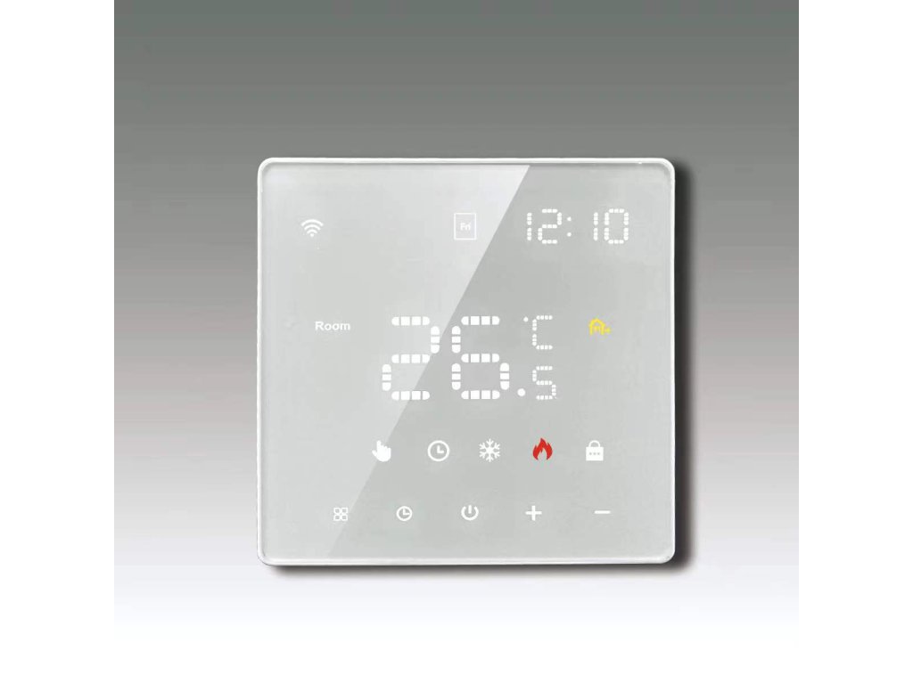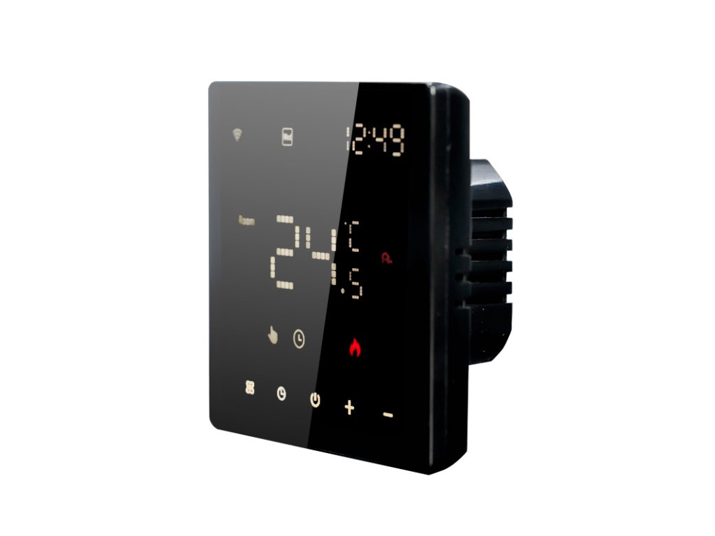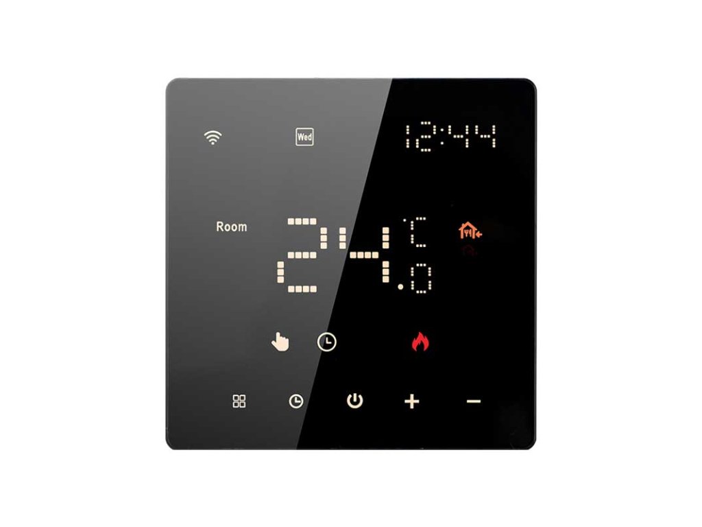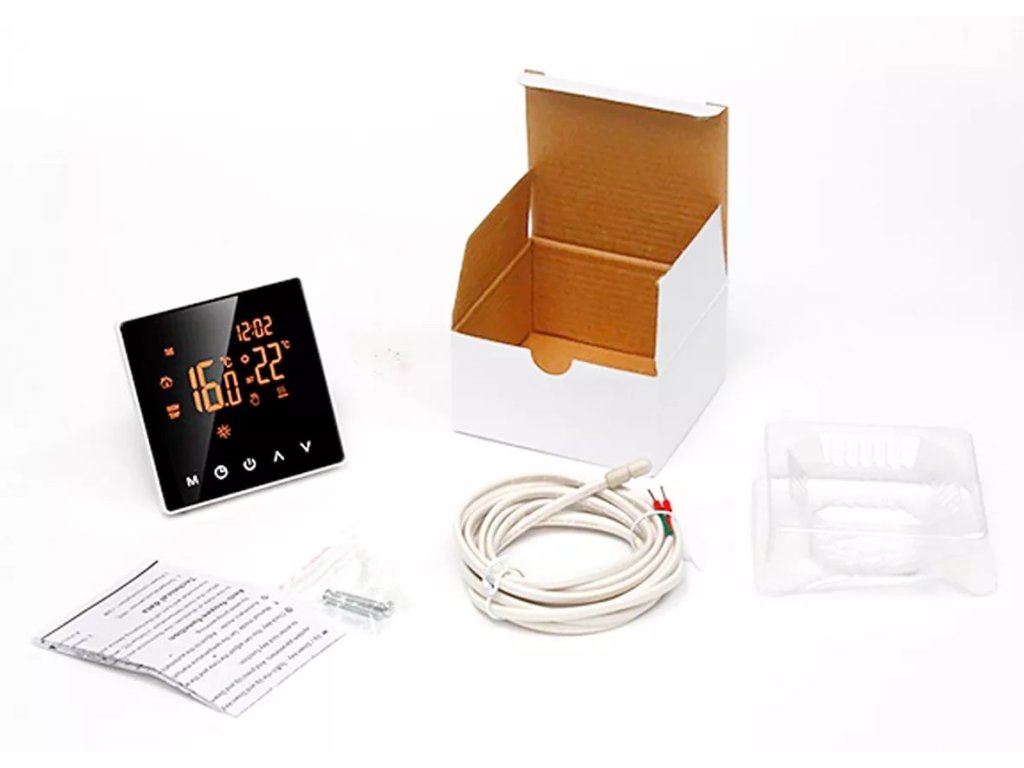 Inteligentny termostat pokojowy, wariant 16A lub 3A, Wi-Fi, sterowanie smartfonem, wyświetlacz dotykowy, możliwość ustawienia temperatury w zakresie 10°C - 30°C, do regulacji: ogrzewania, kotła, bojlera i innych, aplikacja mobilna Tuya Smart / Smart Life, kompatybilny Asystent Google, Amazon Alexa.