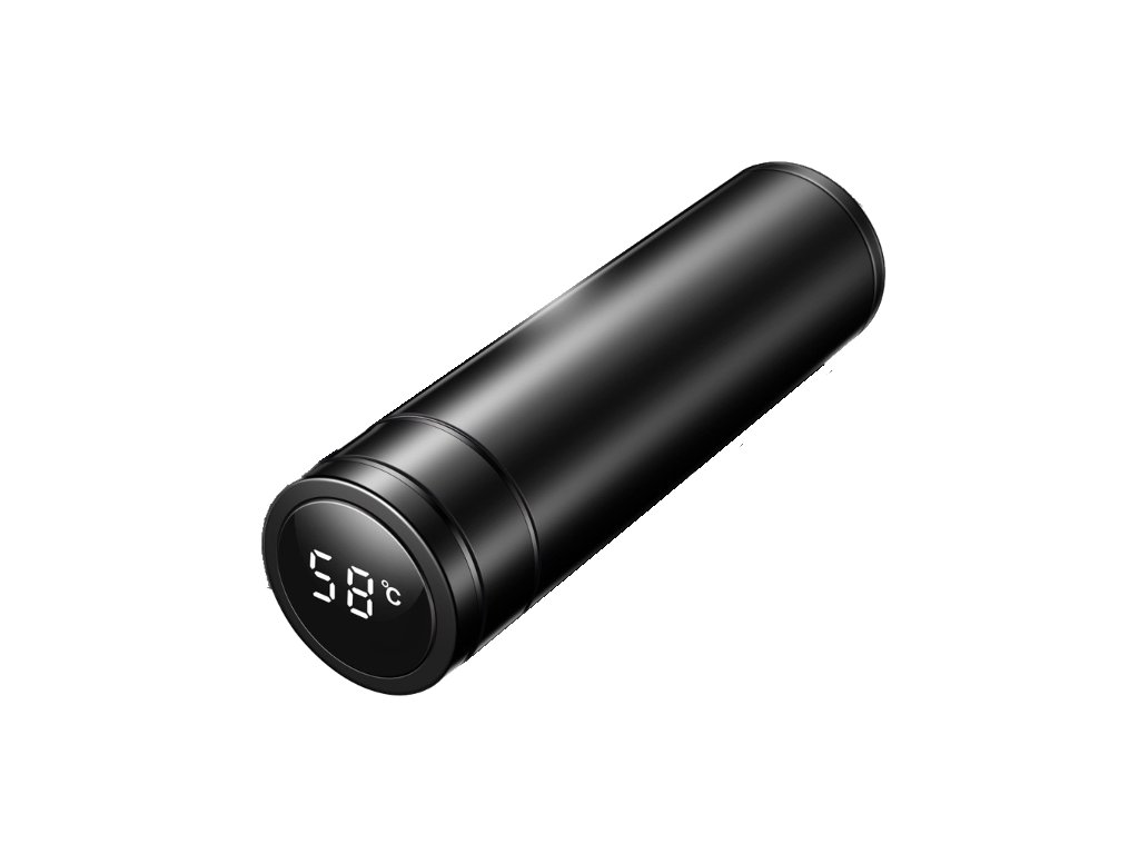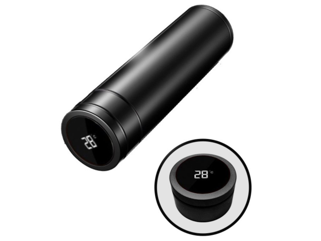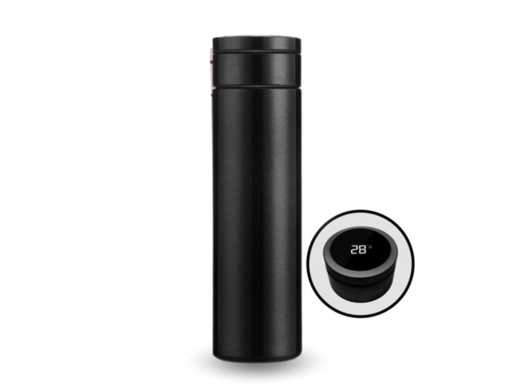 Inteligentny termos z wyświetlaczem na pokrywce pokazującym temperaturę napoju, pojemność 0,5 l, utrzymuje temperaturę od 6 do 12 godzin, wymienna bateria, kolor czarny