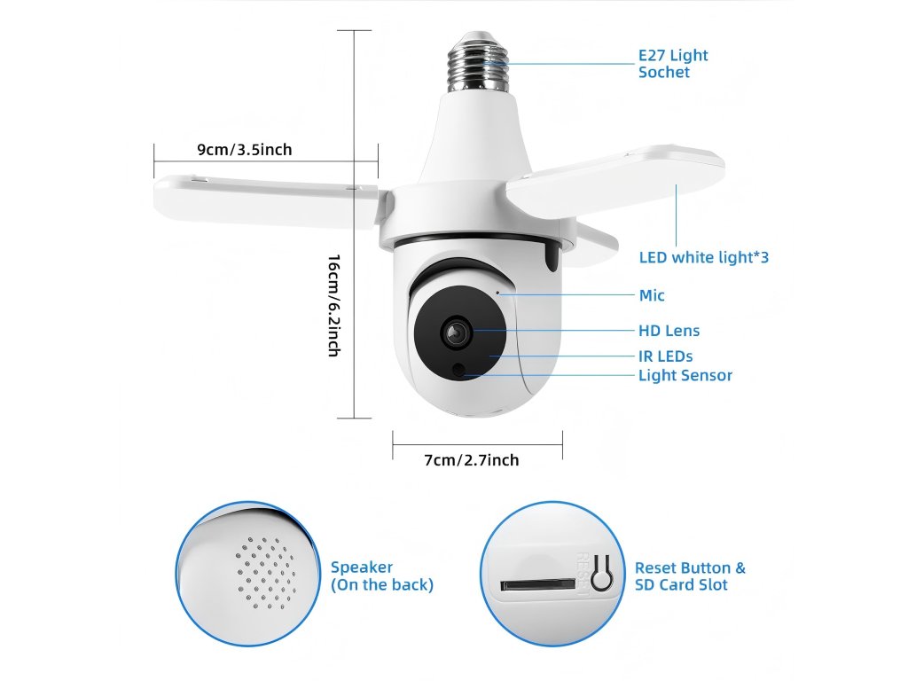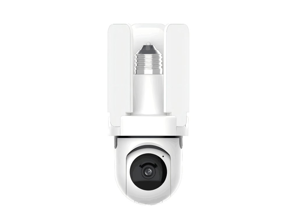 Inteligentna kamera IP do użytku wewnętrznego, lampa LED, Wi-Fi 2,4 GHZ, rozdzielczość 3 MP (2304 x 1296 px), zasilanie z matrycą E27, aplikacja mobilna Tuya Smart, biały design.