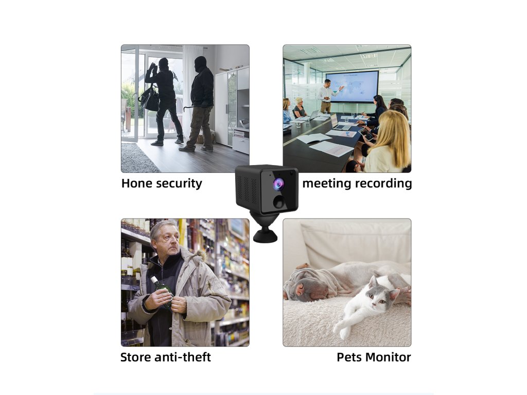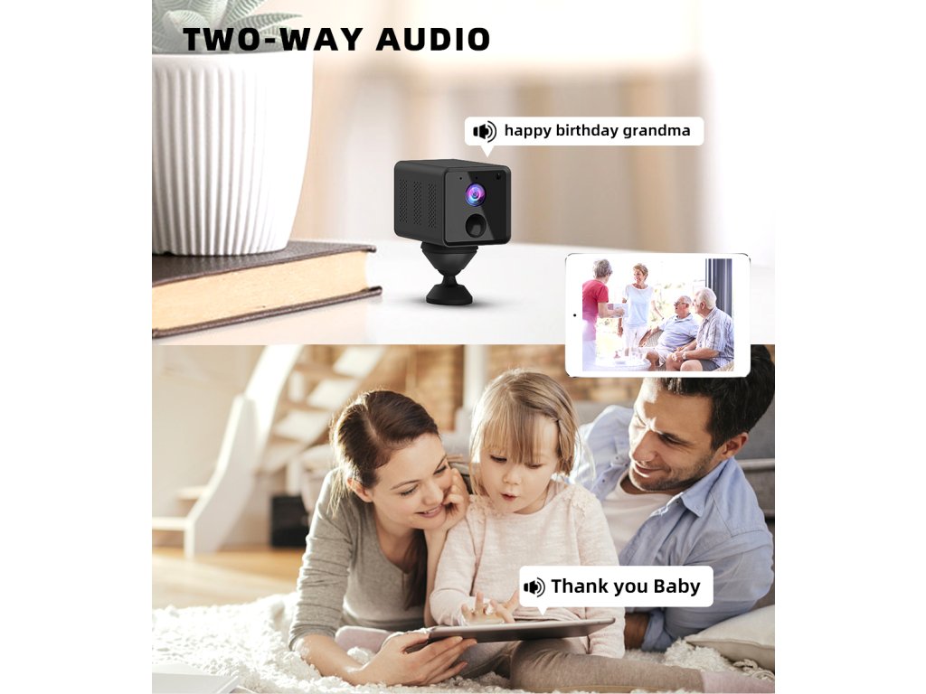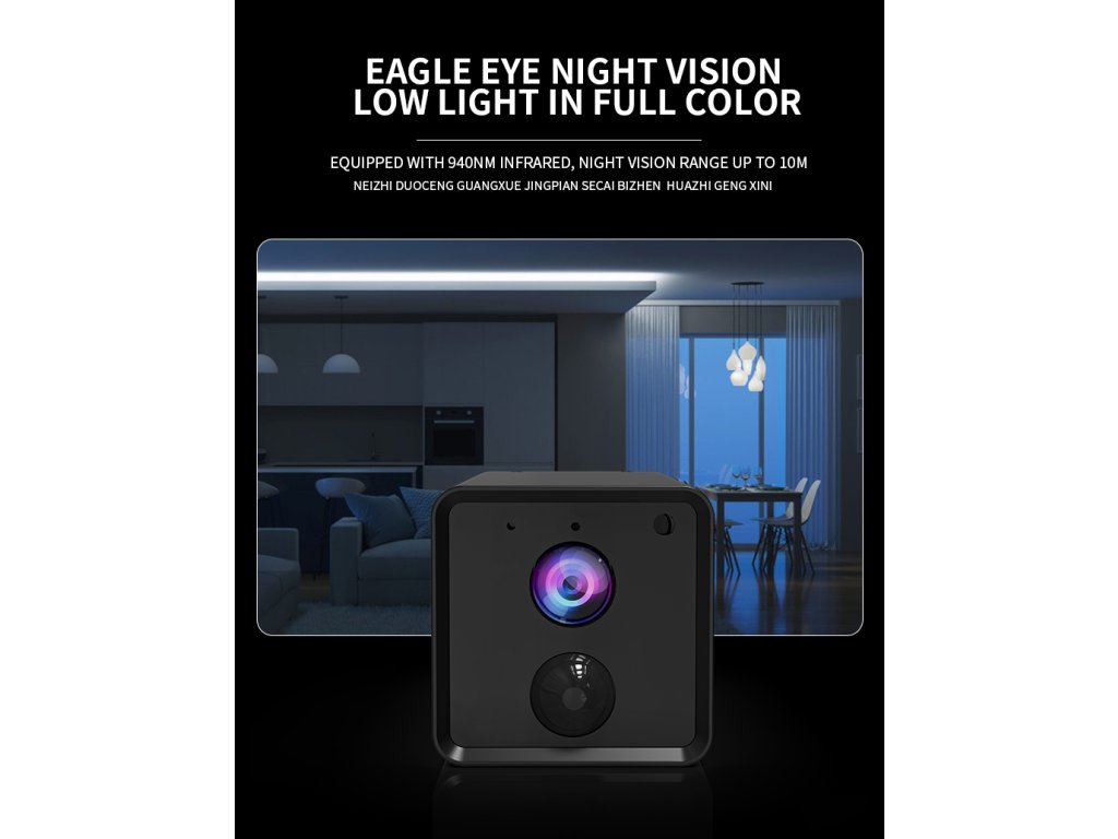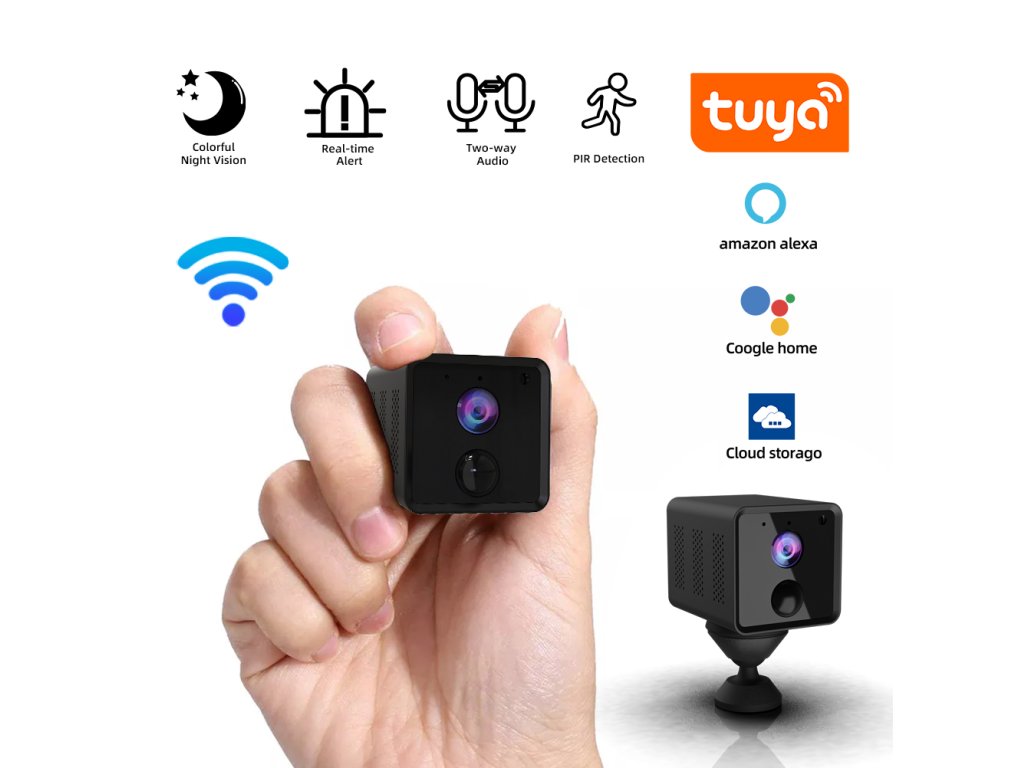 Inteligentna minikamera domowa, Wi-Fiwersja 2,4 GHz lub 4G, rozdzielczość Full HD (1920 × 1080 px), aplikacja mobilna Tuya Smart, kąt widzenia 150°, widoczność w nocy do 10 metrów, bateria 3000 mAh, czarny design.