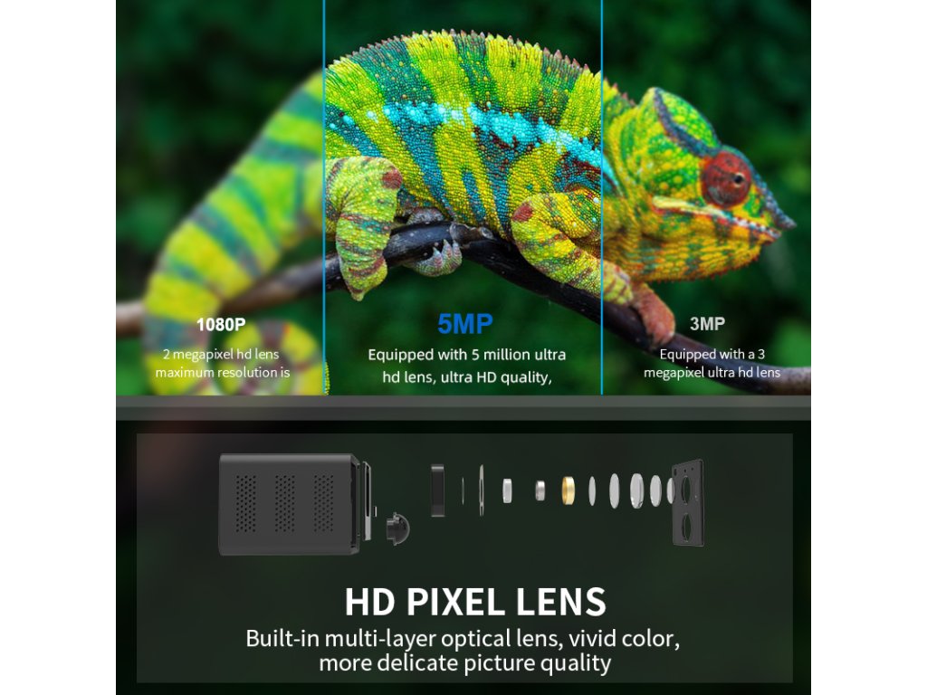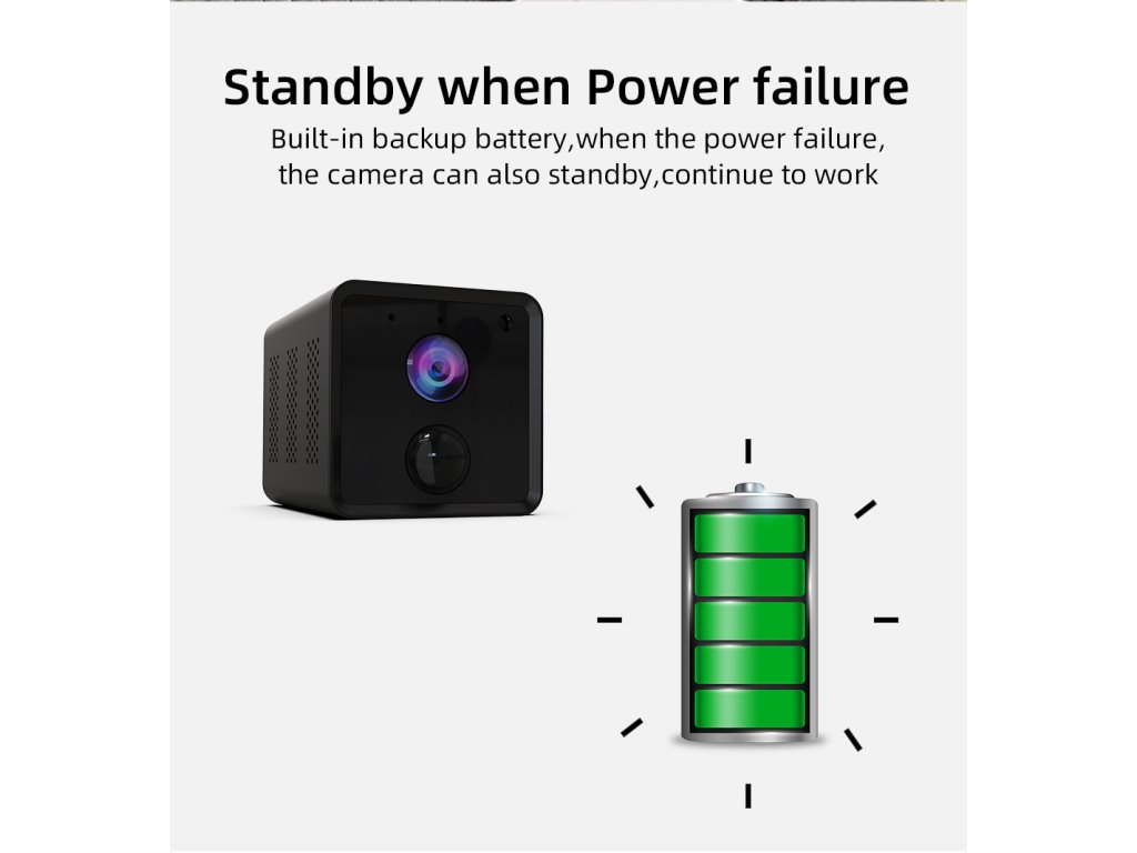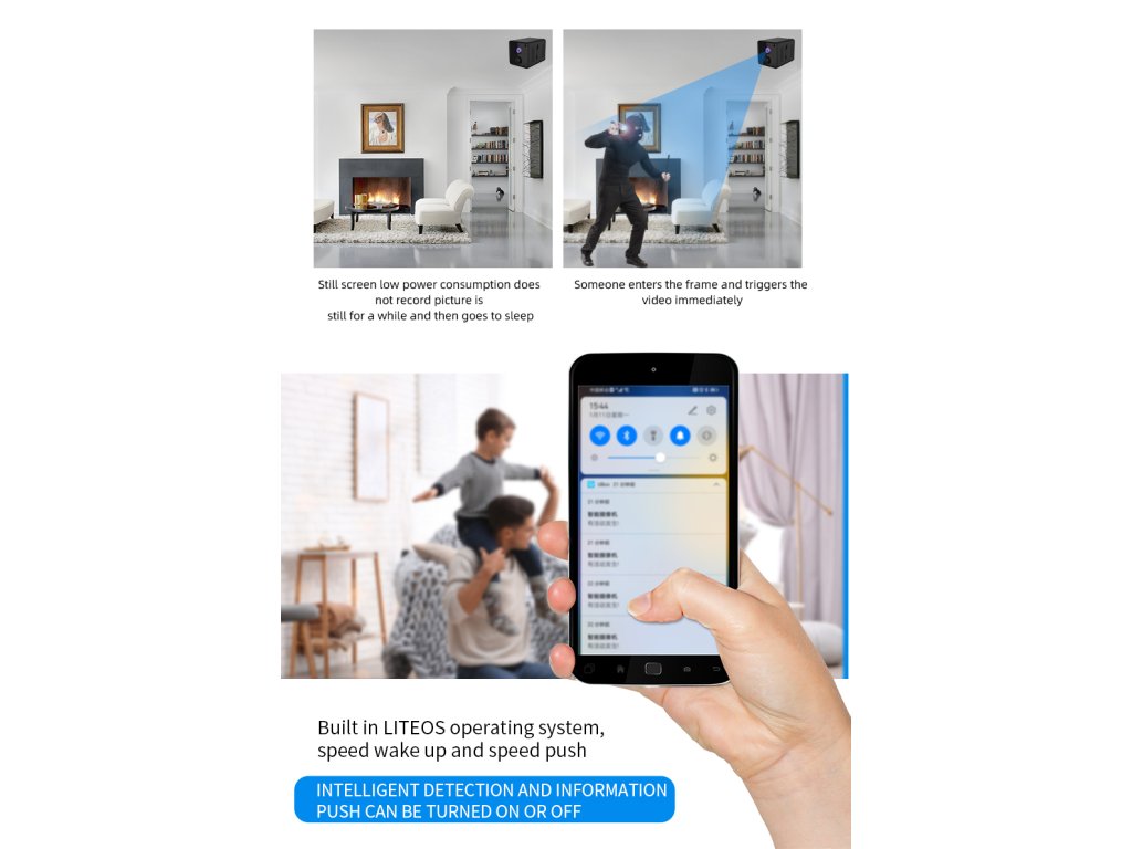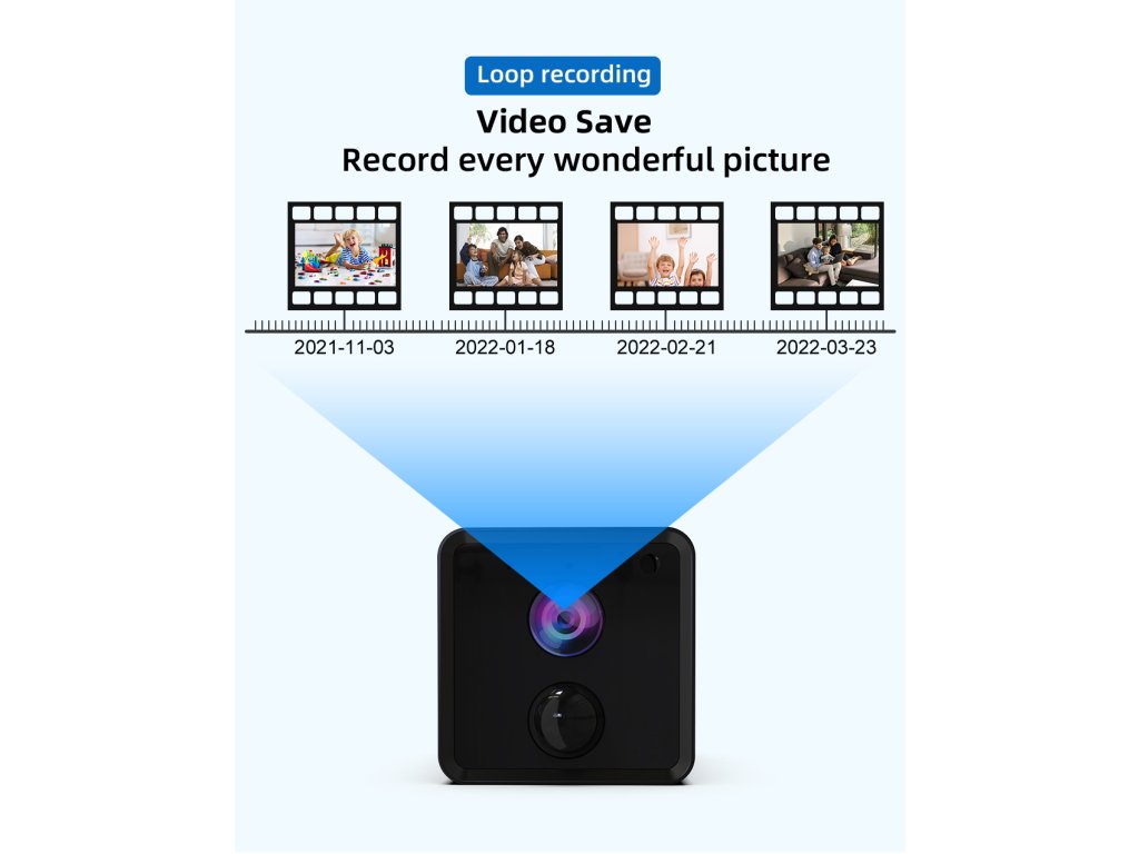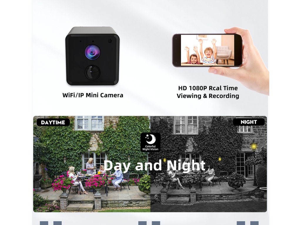 Inteligentna minikamera domowa, Wi-Fiwersja 2,4 GHz lub 4G, rozdzielczość Full HD (1920 × 1080 px), aplikacja mobilna Tuya Smart, kąt widzenia 150°, widoczność w nocy do 10 metrów, bateria 3000 mAh, czarny design.