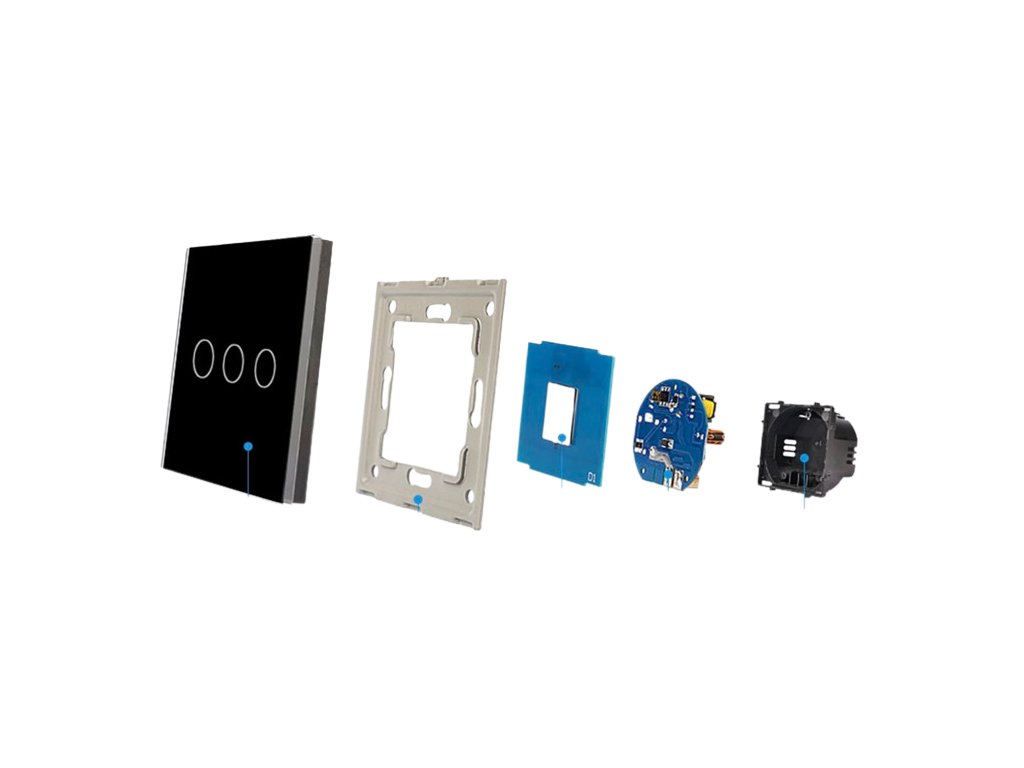 Przełącznik Wi-Fi do oświetlenia i okablowania, trzy przyciski, połączenie przez WiFi, zasilanie sieciowe, kompatybilny z Asystentem Google i Amazon Alexa, aplikacja mobilna Tuya Smart / Smart Life, nie wymaga przewodu neutralnego do funkcjonalnego podłączenia, czarny design.