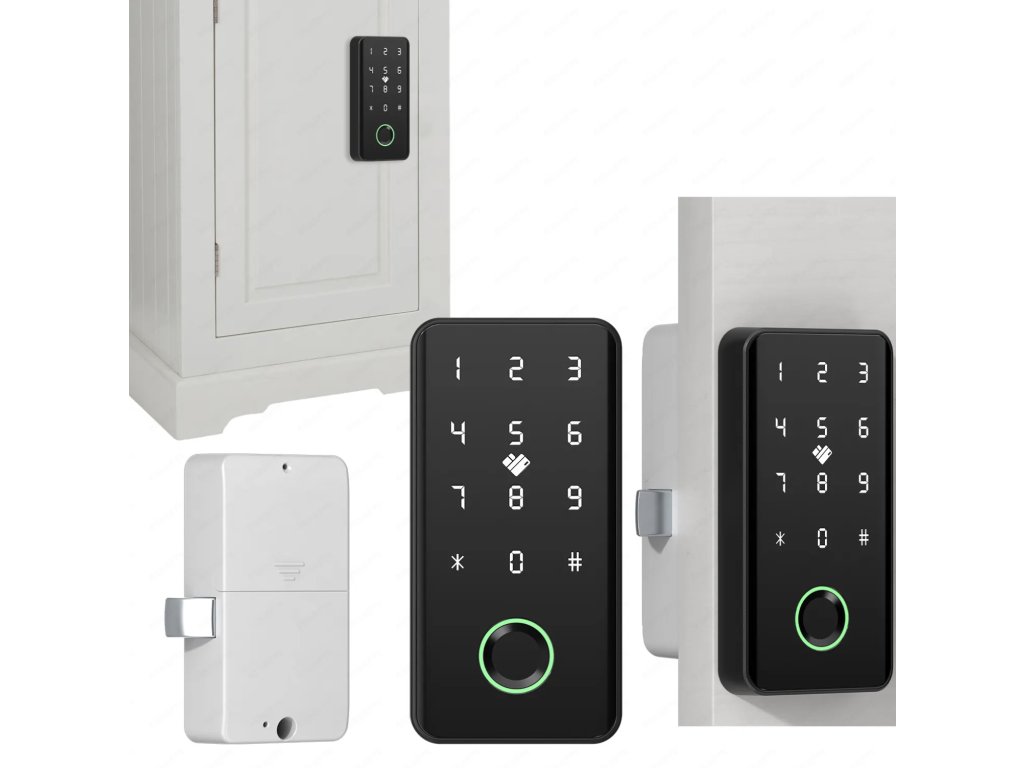 Inteligentny zamek do zamykania mebli, aplikacja mobilna Tuya, Wi-Fi, 4 metody odblokowania (PIN, odcisk palca, karta IC, telefon komórkowy), zasilanie 4 bateriami AAA, czarny design.