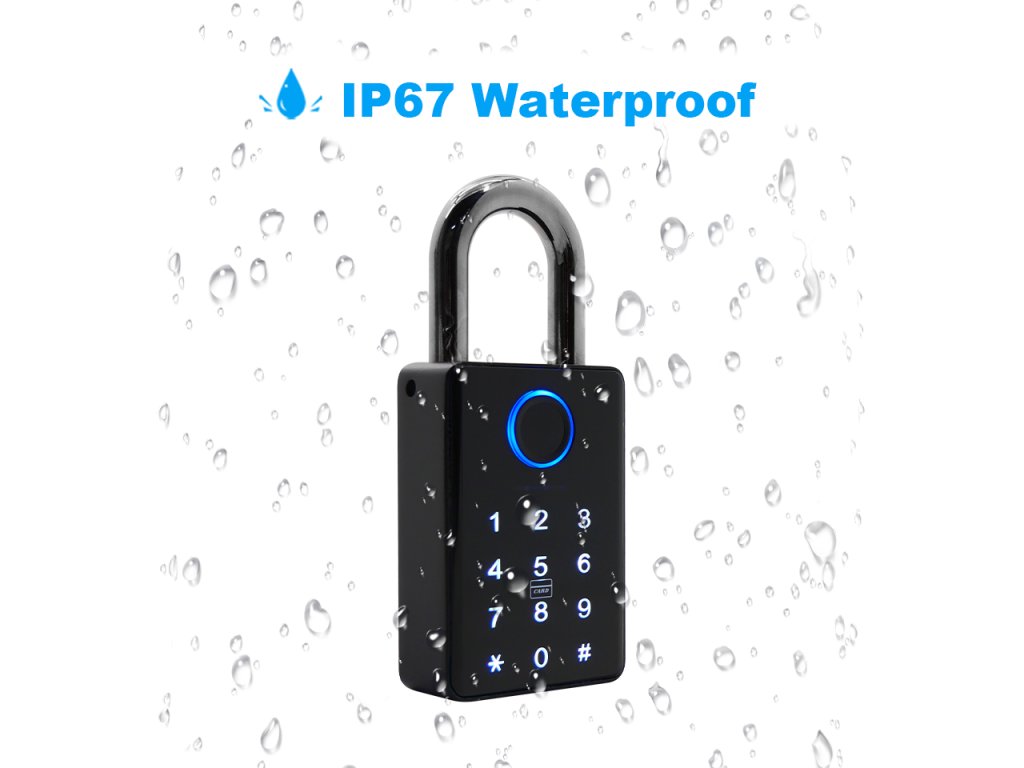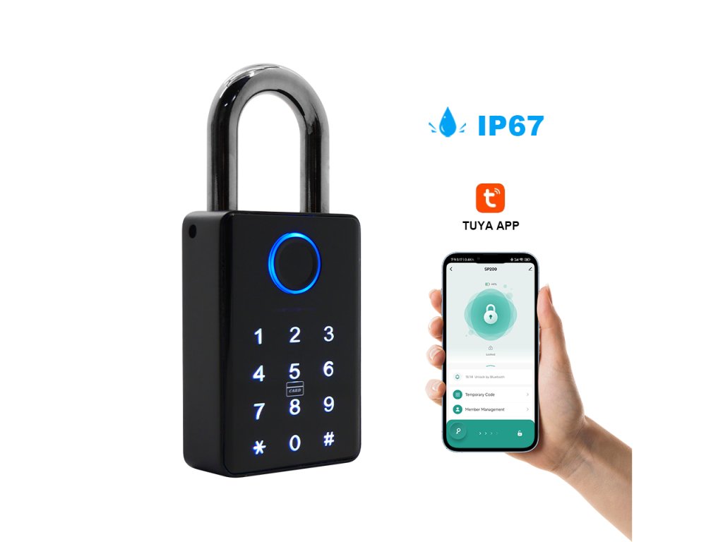 Inteligentna kłódka, Bluetooth, aplikacja mobilna Tuya Smart/Smart Life, odpowiednia do użytku wewnątrz i na zewnątrz, IP67, wbudowana bateria, czarny design.