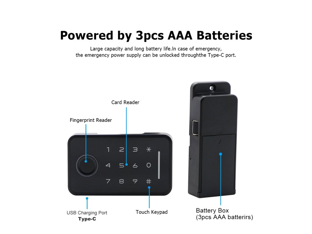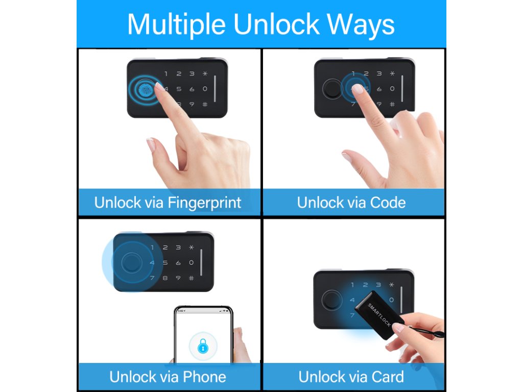 - Opcje odblokowania: Odcisk palca, kod PIN, karta IC, aplikacja mobilna