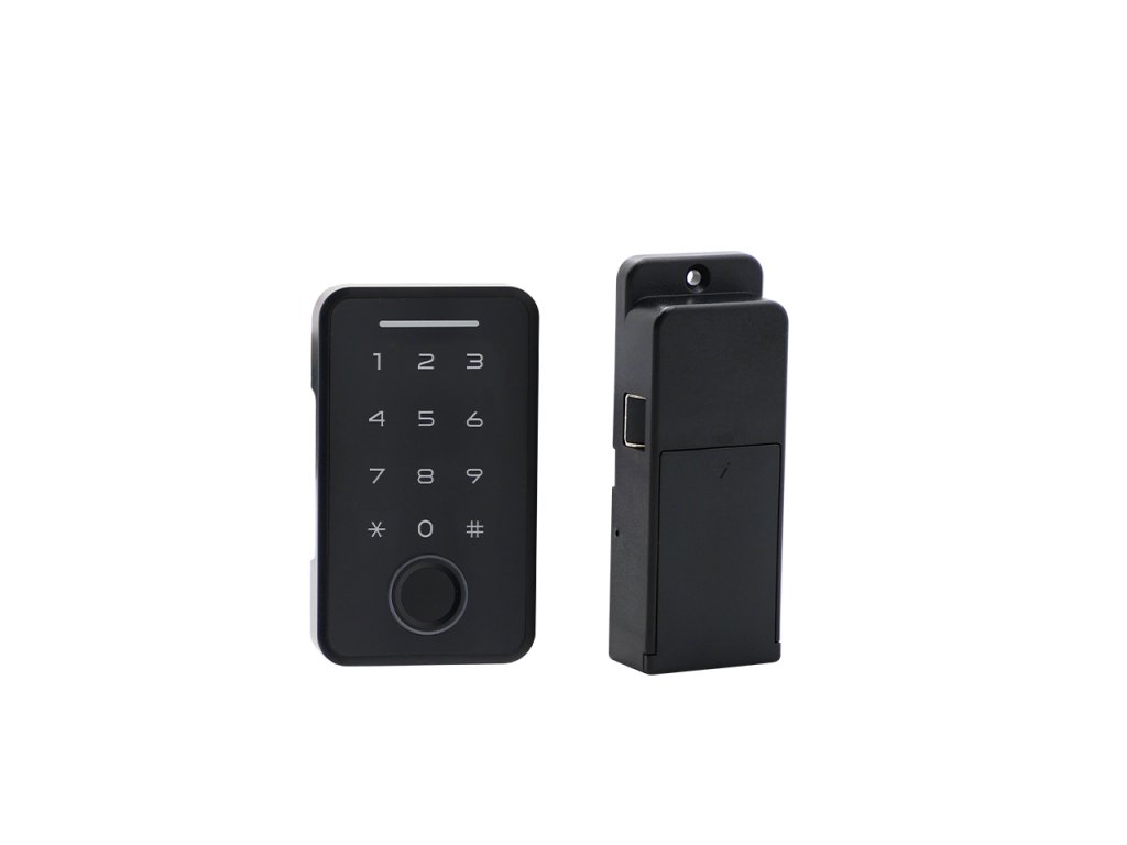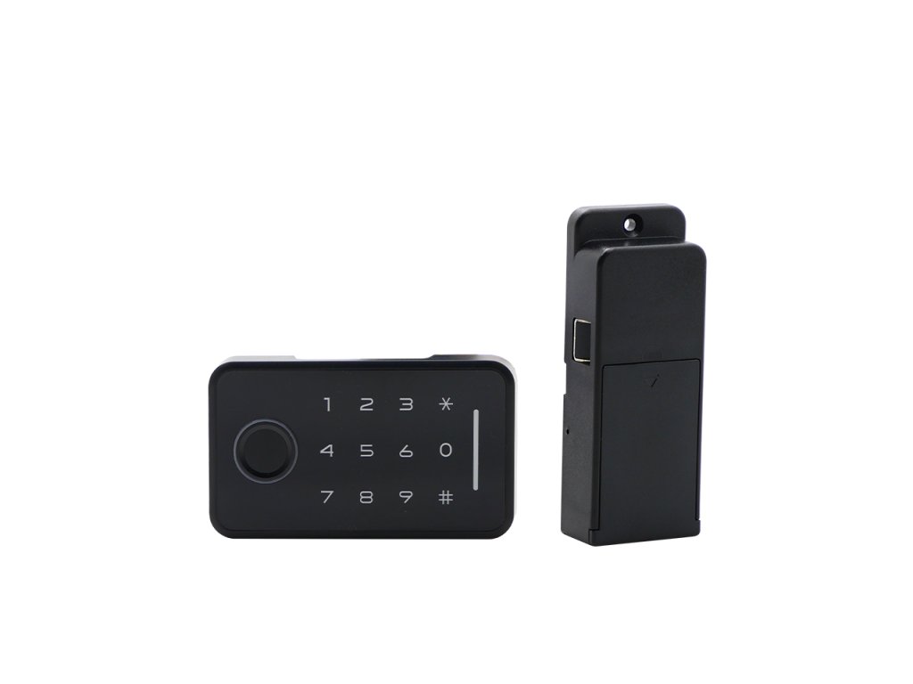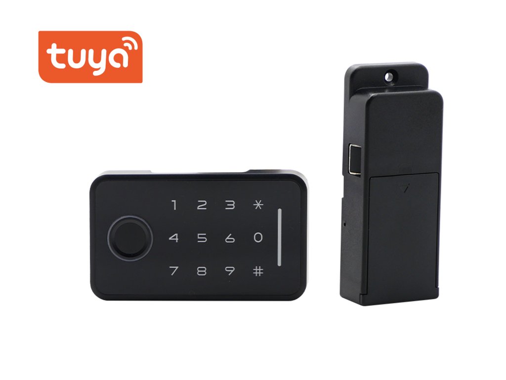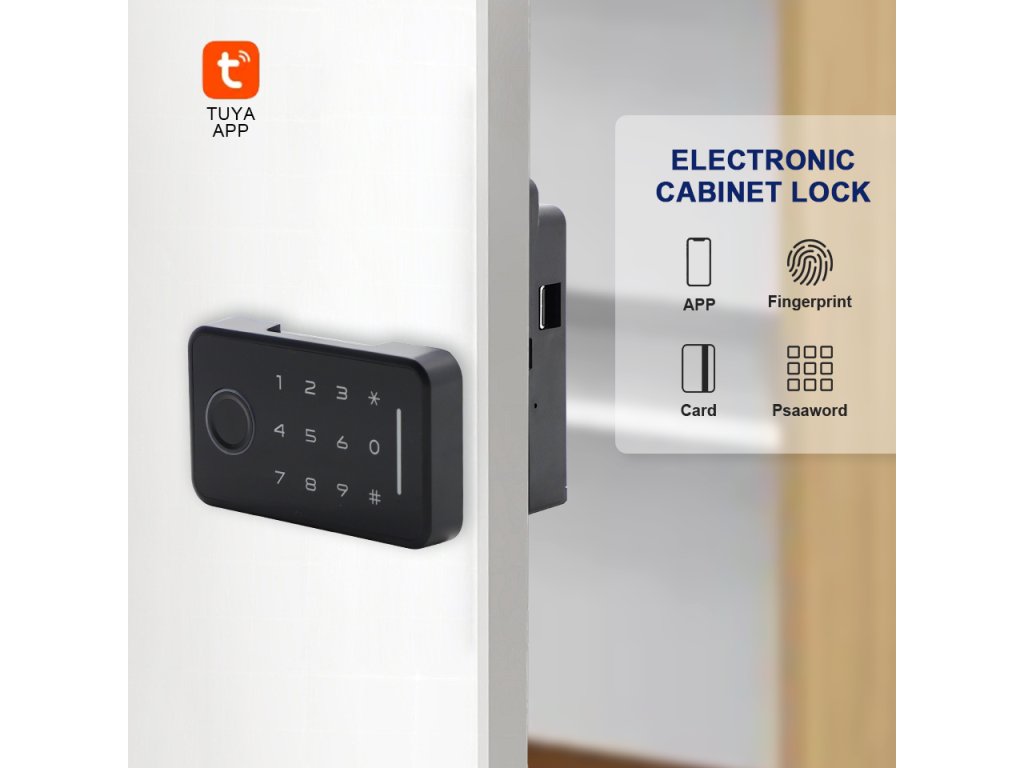Inteligentny zamek do mebli, poziomy, Bluetooth, aplikacja mobilna Tuya Smart/Smart Life, 4 opcje odblokowania (odcisk palca, kod numeryczny, karta inteligentna, telefon komórkowy), zasilany bateryjnie, czarny design.
