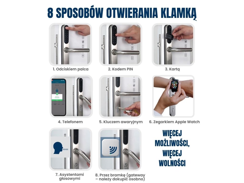 "Przy tylu sposobach otwierania drzwi czasem mam problem zdecydować, którego użyć :D najbardziej lubię przez Wi-Fi, więc polecam dokupić bramkę Wi-Fi (gateway). Produkt niezawodny i praktyczny. Polecam."