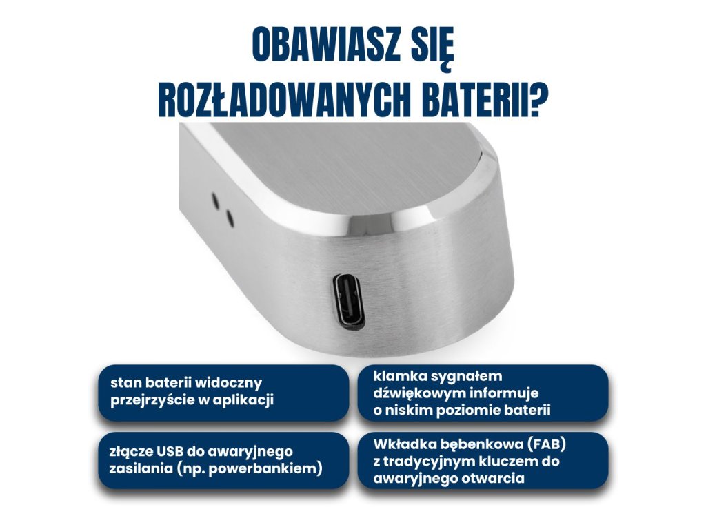 Dobre baterie wytrzymują w klamce nawet 10 miesięcy przy 20 otwarciach dziennie. W aplikacji masz zawsze podgląd stanu naładowania. Jeśli mimo to baterie rzeczywiście się rozładują, możesz otworzyć drzwi klasycznym kluczem (jeśli masz zainstalowaną wkładkę cylindryczną) lub łatwo podłączyć klamkę przez UBS np. do powerbanku lub innego źródła zasilania i otworzyć drzwi.
