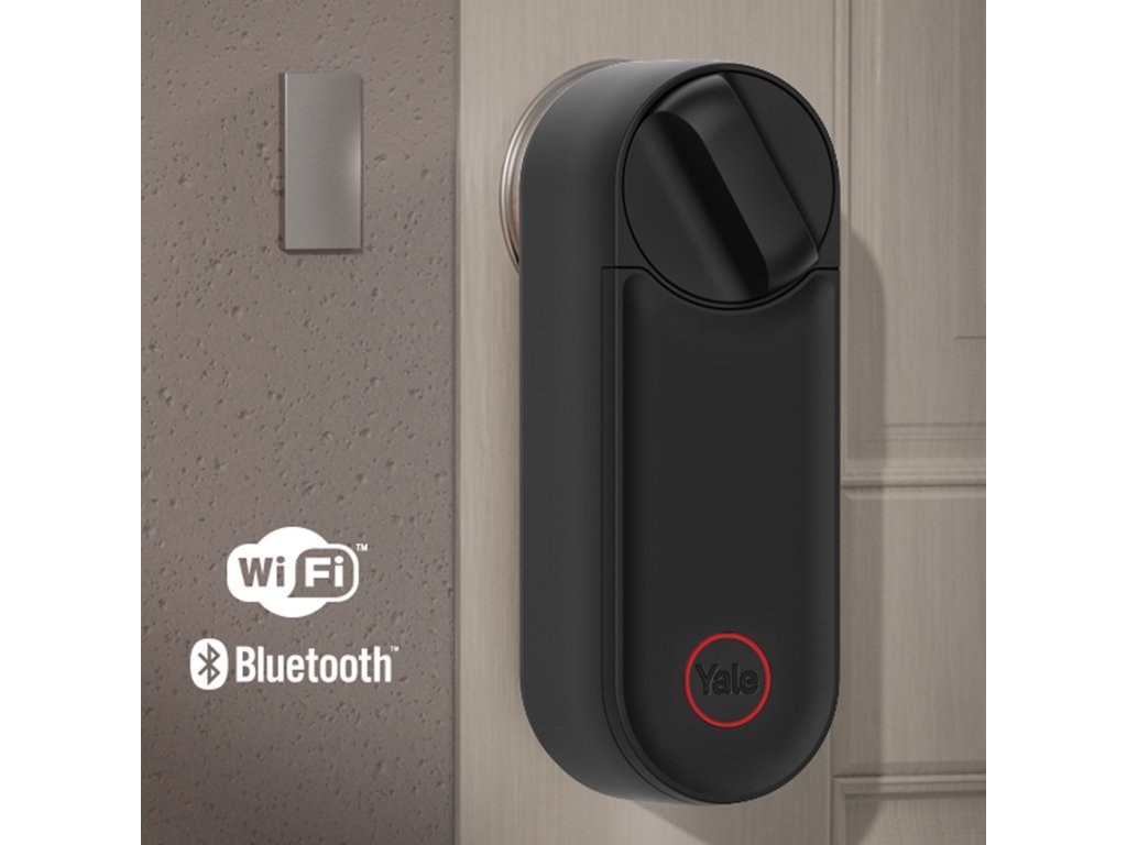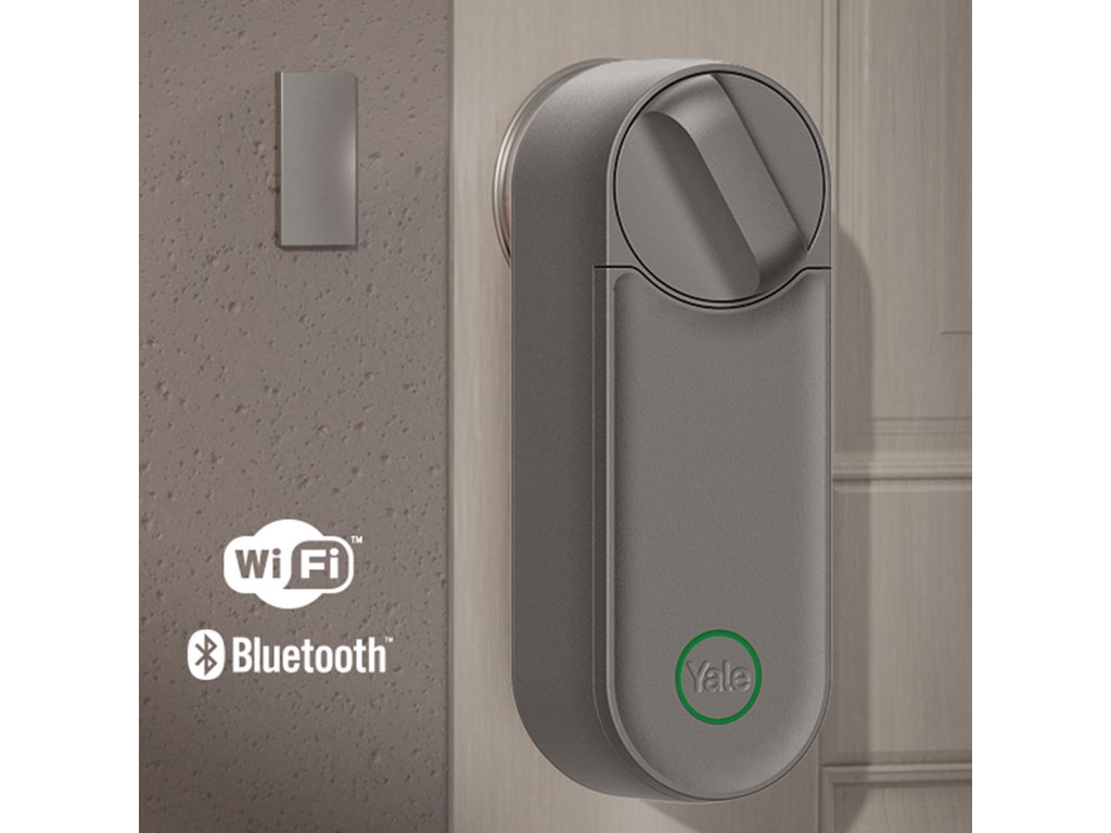 Inteligentny zamek, Yale Linus, Bluetooth, WiFi, aplikacja mobilna na Androida i iOS, szyfrowanie AES-128, zasilanie bateryjne, kompatybilność z Amazon Alexa lub Google Home, czarno-srebrny design.