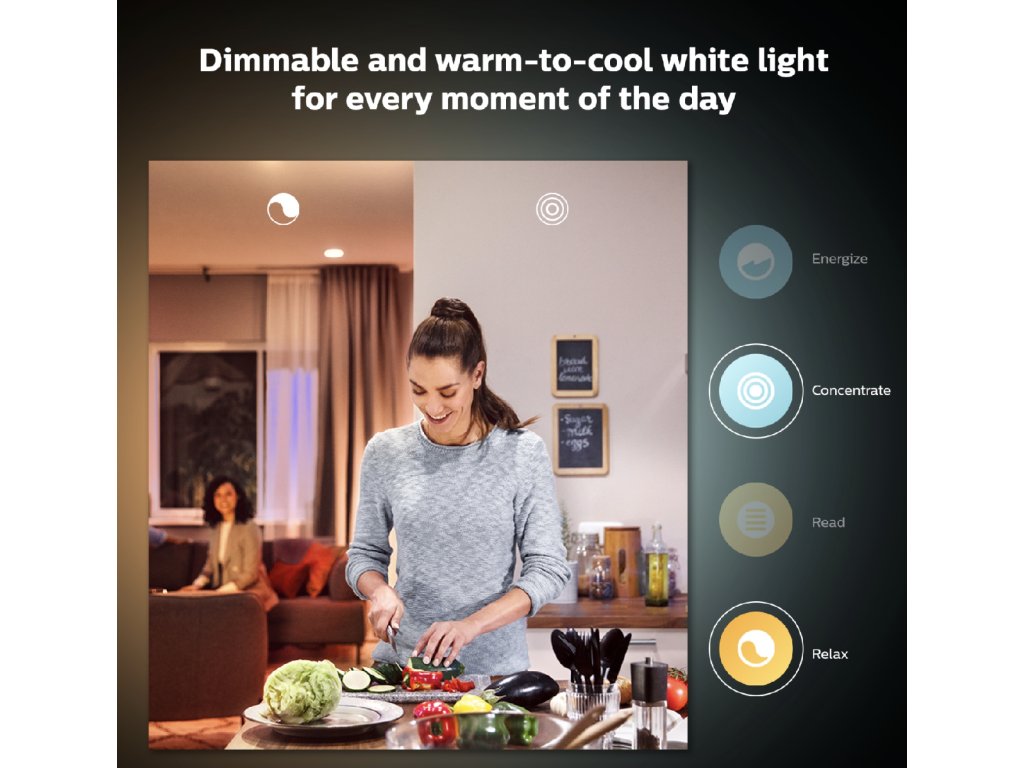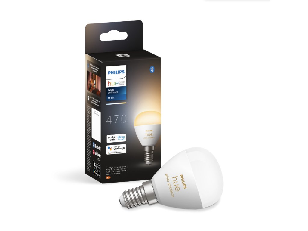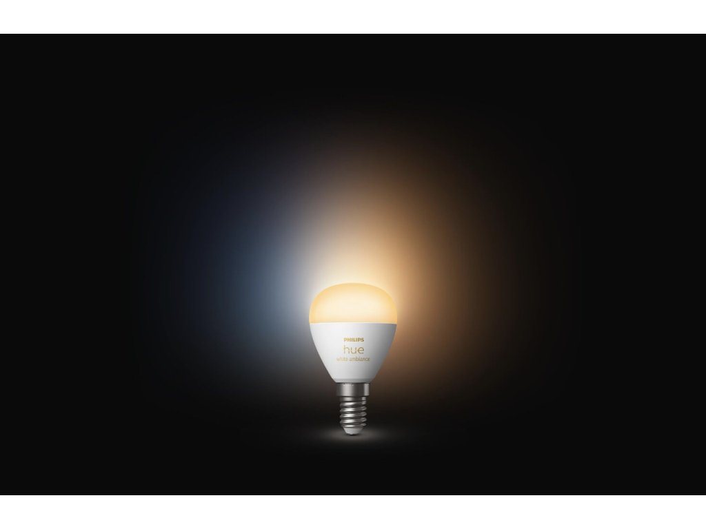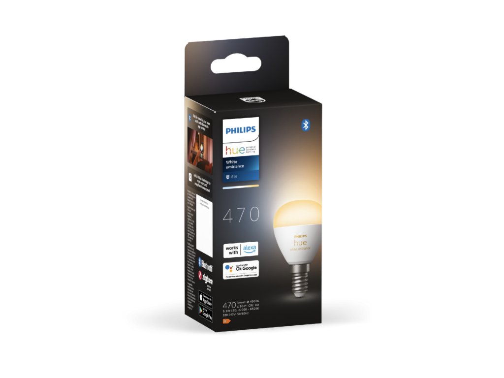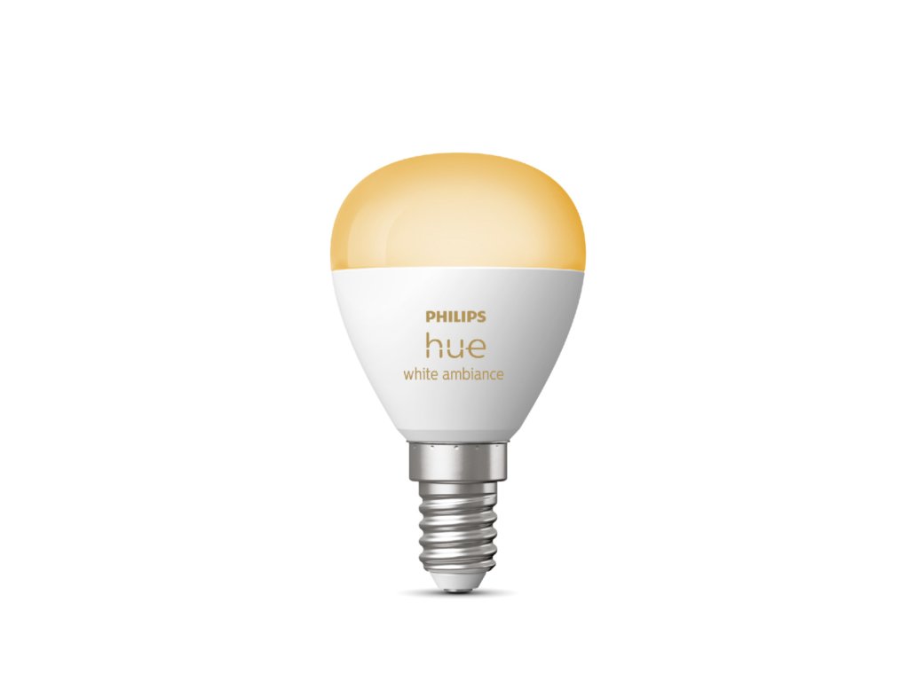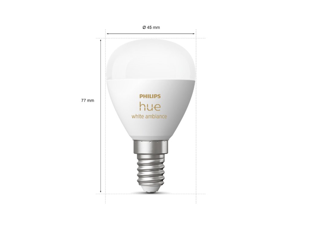 Inteligentna żarówka LED Philips Hue White Ambiance o tradycyjnym designie z matową, białą żarówką w kształcie kropli P45 emituje silne światło o temperaturze chromatycznej od 2200 K do 6500 K, którą można przyciemniać i regulować odcień białego światła za pomocą pilota Philips Dimmer Switch (nie znajduje się w zestawie) lub aplikacji mobilnej Philips Hue, którą można łatwo pobrać z Google Play lub Apple Store.